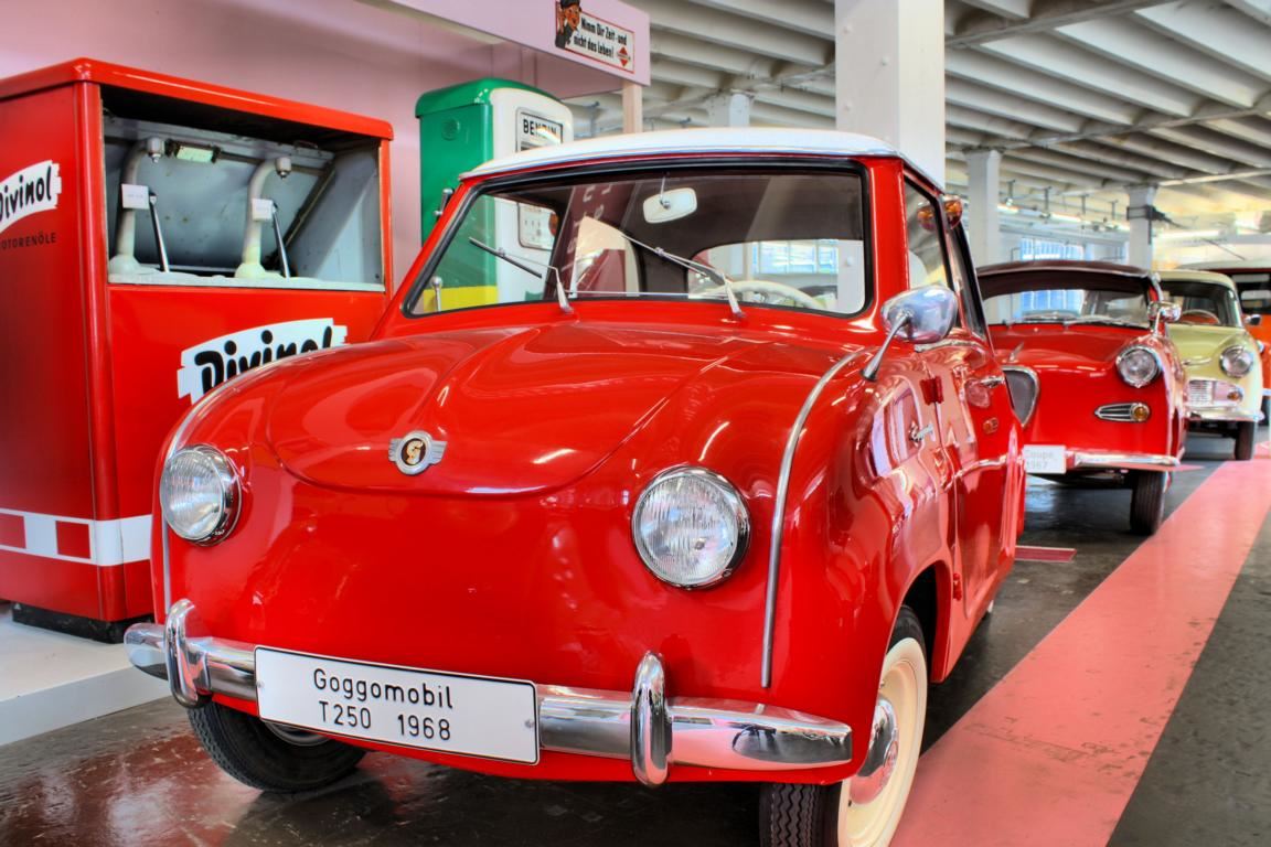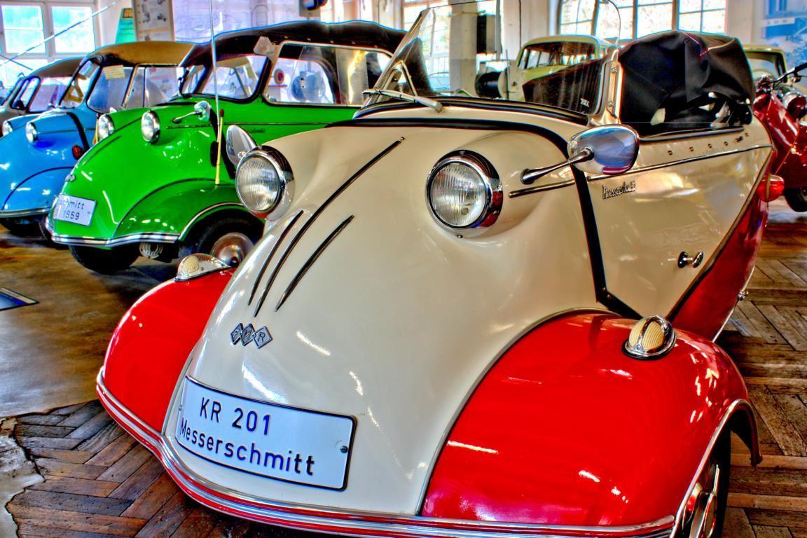 Durch den verlorenen Krieg waren zahlreiche Flugzeugkonstrukteure ohne Arbeit. Ihr Talent brachten sie in die Automobilentwicklung ein, was sich natürlich in deren Formen ausdrückte, schließlich wussten diese Ingenieure etwas über die Wichtigkeit des Luftwiderstands. Der Kabinenroller von Messerschmitt, scherzhaft vom Volksmund auch „Schneewittchensarg“ genannt, ist der wohl bekannteste Vertreter seiner Zunft. Die sportliche Variante des Kabinenrollers war der „Renntiger“, der mit nur 19 PS eine Geschwindigkeit von 140 km/h schaffte. Hier bleibt man gerne stehen und lässt die automobilen 1950er Jahre auf sich wirken.