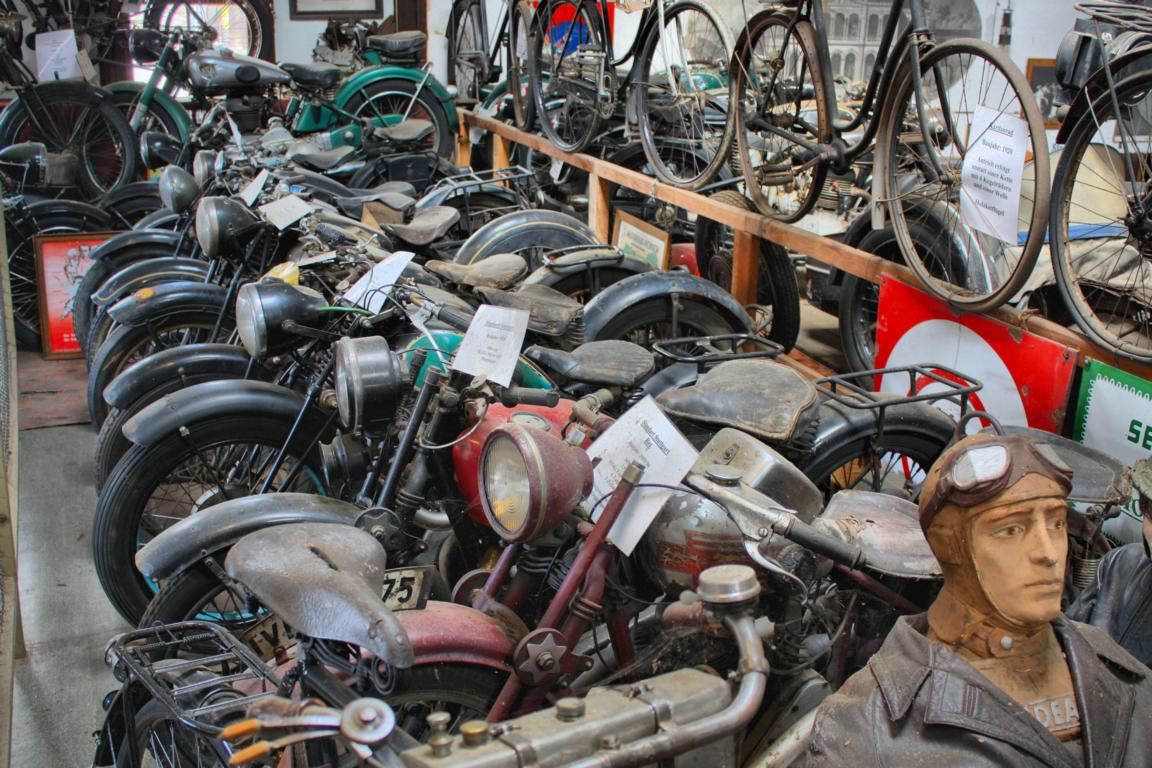 Ohne Übertreibung ist festzustellen, dass es schwer ist, eine zweite, derart große Sammlung seltener Zweiräder in Deutschland zu finden. Hier ist nicht nur das Motorrad ›Imme‹ zu sehen, das vom Ausnahme-Konstrukteur Norbert Riedel entwickelt wurde, sondern auch andere Zweirad-Meilensteine, wie etwa die ›Megola‹ aus den 1920er Jahren. Dieses Motorrad wurde mit einem Fünfzylinder-Umlaufmotor gebaut, der direkt in das Vorderrad eingebaut wurde. Es gab weder Schaltgetriebe noch Kupplung, weshalb dieses Motorrad nach jedem Halt angeschoben werden musste, um den Motor wieder zu starten. Kein Wunder, dass davon nur 2 000 Stück gebaut wurden.