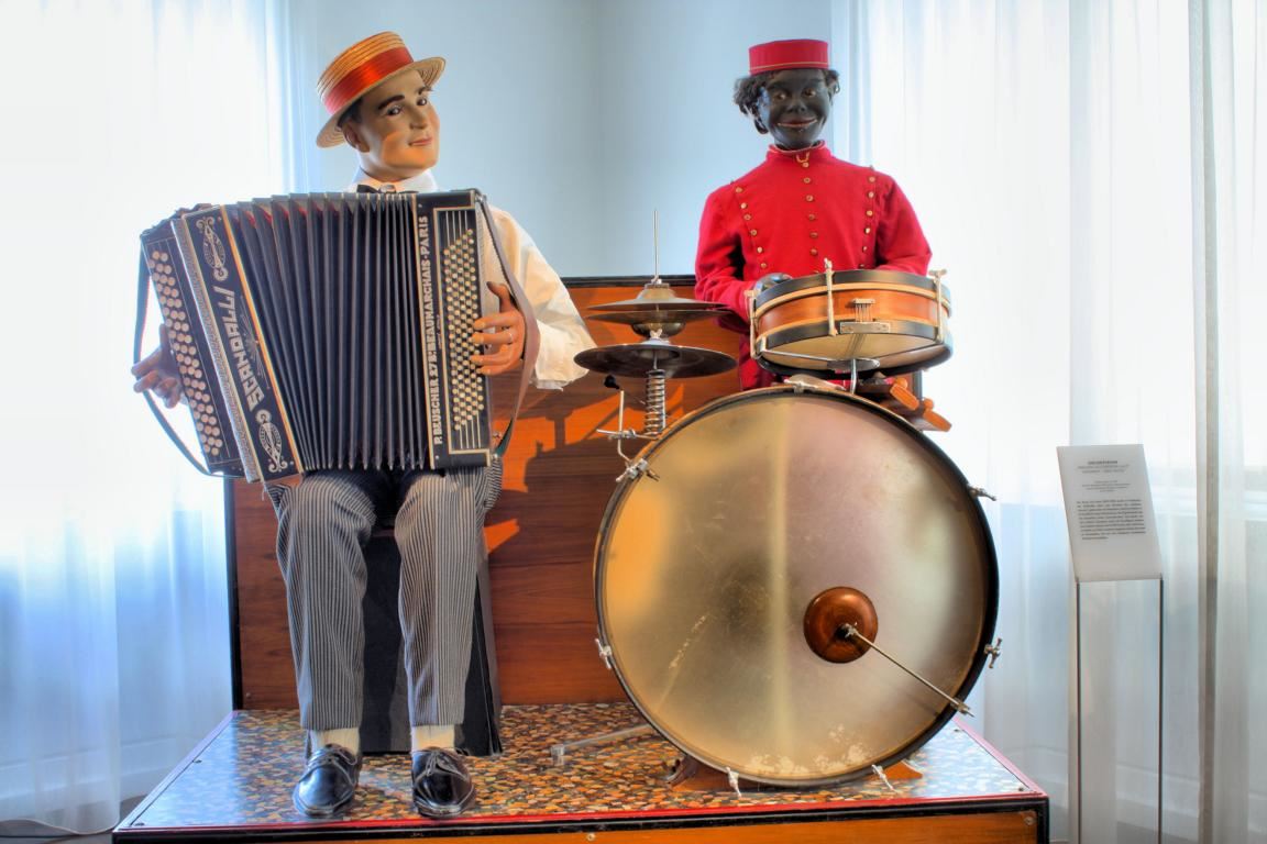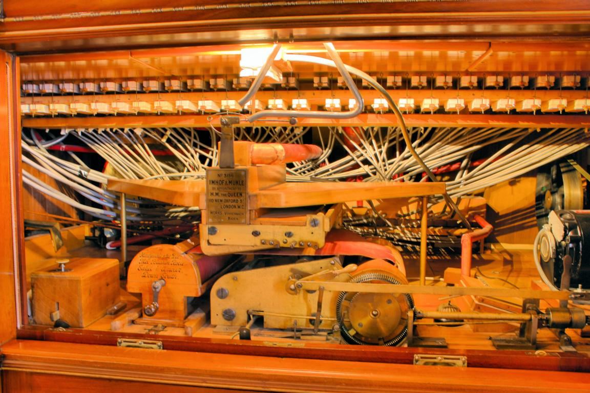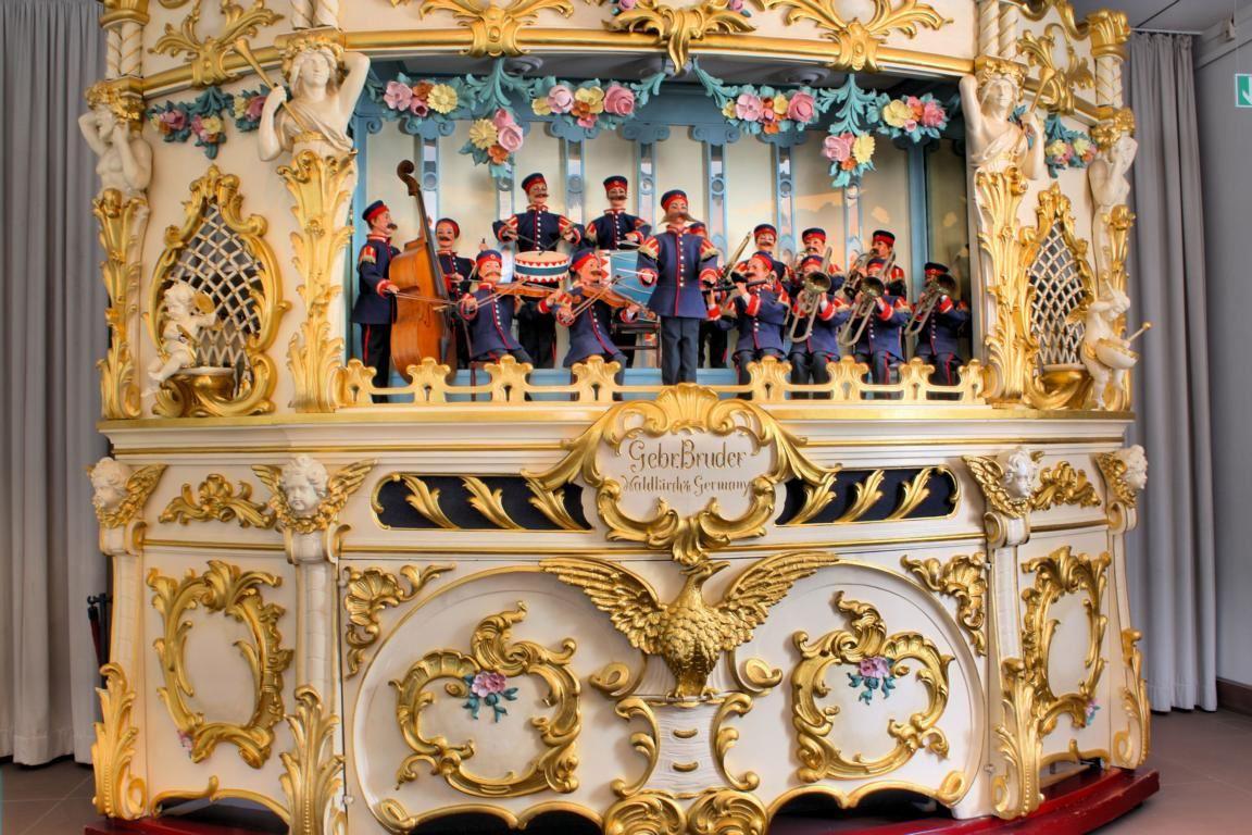 Das Besondere am Deutschen Musikautomaten-Museum ist, dass nahezu alle Instrumente vorführbereit sind und daher der einmalige Sound dieser Orchestrien live genossen werden kann. Insbesondere die jüngeren Exemplare besitzen eine unglaublich mitreißende Klangfülle, die man unbedingt einmal erlebt haben muss. Kein Wunder, dass diese Instrumente nicht nur auf Jahrmärkten, sondern auch in Gasthäusern vorzufinden waren. Schließlich sorgen Menschen mit guter Stimmung für ein sattes Umsatzplus. Bewegte Figuren waren ein beliebtes Beiwerk großer Orchestrien. Doch wurden diese auch gerne in den Mittelpunkt gerückt, wie das ebenfalls im Museum zu bewundernde Orchestrion ›Pneuma-Accordeon Jazz‹ zeigt. Die Figuren bewegen die Augen, drehen den Kopf, öffnen den Mund und ziehen die Augenbrauen nach oben. Derart interessante mechanische Konstruktionen finden sich hinter jedem Gehäuse von Orchestrions. Besonders hervorzuheben ist das Modell B der ›-Phonoliszt- Violina ‹ des Unternehmens Ludwig Hupfeld. Dieser Firma war es gelungen, ein Klavier mit echten Geigen zu kombinieren. Gesteuert von einer Notenrolle werden drei aufrecht stehende Geigen durch eine pneumatisch betriebene Mechanik nach vorn gegen einen rotierenden kreisförmigen Geigenbogen gedrückt, wodurch die Saiten zum Schwingen kommen. Kleine Tastenhebel greifen am Hals der Geige in die Saite, wodurch die Tonhöhe variiert wird. Die Lautstärke hingegen wird durch unterschiedlich starkes Andrücken der Saiten an den rotierenden Ringbogen erzielt. Ein mechanisches Wunderwerk, das damals als „achtes Weltwunder“ bezeichnet wurde. Ein Titel, der sicher übertrieb, doch angesichts des unglaublichen mechanischen Aufwands schon ein klein wenig berechtigt war. Überhaupt gibt es im Museum eine große Fülle außergewöhnlicher Exponate zu sehen, die nicht nur mit ihrer Technik, sondern auch mit ihrer Geschichte überraschen. So ist in Bruchsal beispielsweise eine Orgel zu besichtigen, die gerne immer wieder als „Titanic-Orgel“ bezeichnet wird. Es handelt sich hierbei um eine im Jahre 1912 vom Freiburger Unternehmen Welte gebaute Philharmonie-Salonorgel, die der Legende nach für den Luxus-Dampfer ›Titanic‹ gebaut worden sein soll. Dem Untergang des Schiffes entkam sie und blieb der Nachwelt erhalten, da sie, so eine These, nicht rechtzeitg fertiggestellt werden konnte. Die papierrollenbetriebene Orgel gehörte zum Modernsten, was Musikautomatenhersteller damals produzierten. Ihr Aufbau unterscheidet sich in vielerlei Hinsicht von den Orchestrien und bot neuen klanglichen und ästhetischen Genuss..