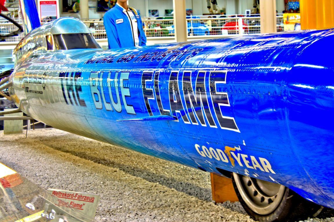 Etwas ganz besonders Sehenswertes in Sinsheim ist der ›Blue Flame‹. Dieses extrem langgestreckte Fahrzeug wurde von einer Rakete angetrieben und hat, mit dem amerikanischen Fahrer Gary Gabelich am Steuer, im Jahr 1970 einen neuen Weltrekord für Landfahrzeuge aufgestellt. Sagenhafte 1001,452 km/h konnten damals auf dem Bonneville-Salzsee gemessen werden.