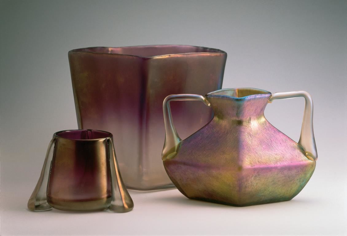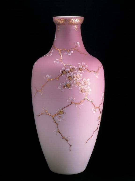 So gibt es hier beispielsweise eine Vase mit Kirschblüten aus der Glashütte Johann Lötz zu sehen, die im Jahre 1892 für die in Chicago im Jahre 1893 abgehaltene Weltausstellung produziert wurde. Mit dem Modell ›Sonnenuntergang‹ hatte das gleiche Unternehmen eine Vase für die Pariser Weltausstellung im Jahre 1900 hergestellt, die in Überfangtechnik ausgeführt wurde. Auf diese Weise war es möglich, einen Farbverlauf zu realisieren, der einem Sonnenuntergang ähnelte.