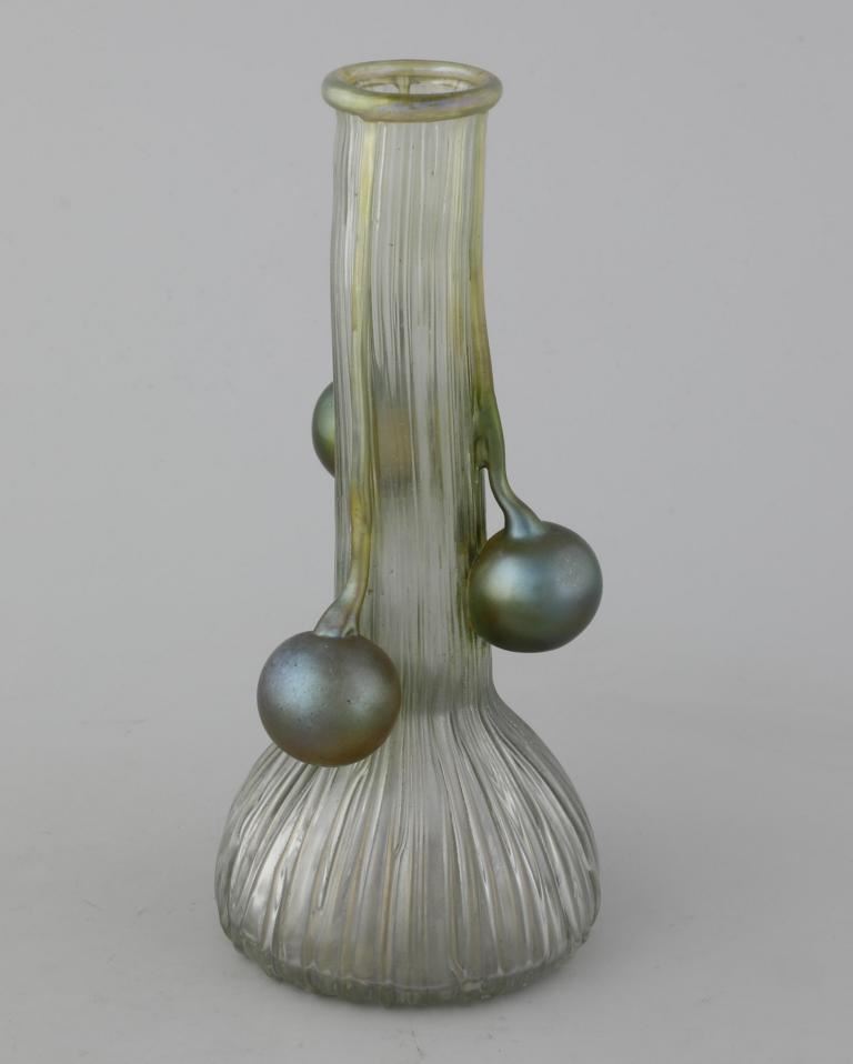 Das Bild zeigt eine Vase mit vier aus der Wandung herausgezogene Henkel aus der Glashütte Johann Lötz Witwe. Wegen ihrer ausdrucksstarken, dynamisch wirkenden Formgestaltung in meisterhafter Ausführung gehören diese Vasen zu den interessantesten Zeugnissen der Lötz-Produktion nach 1900.
