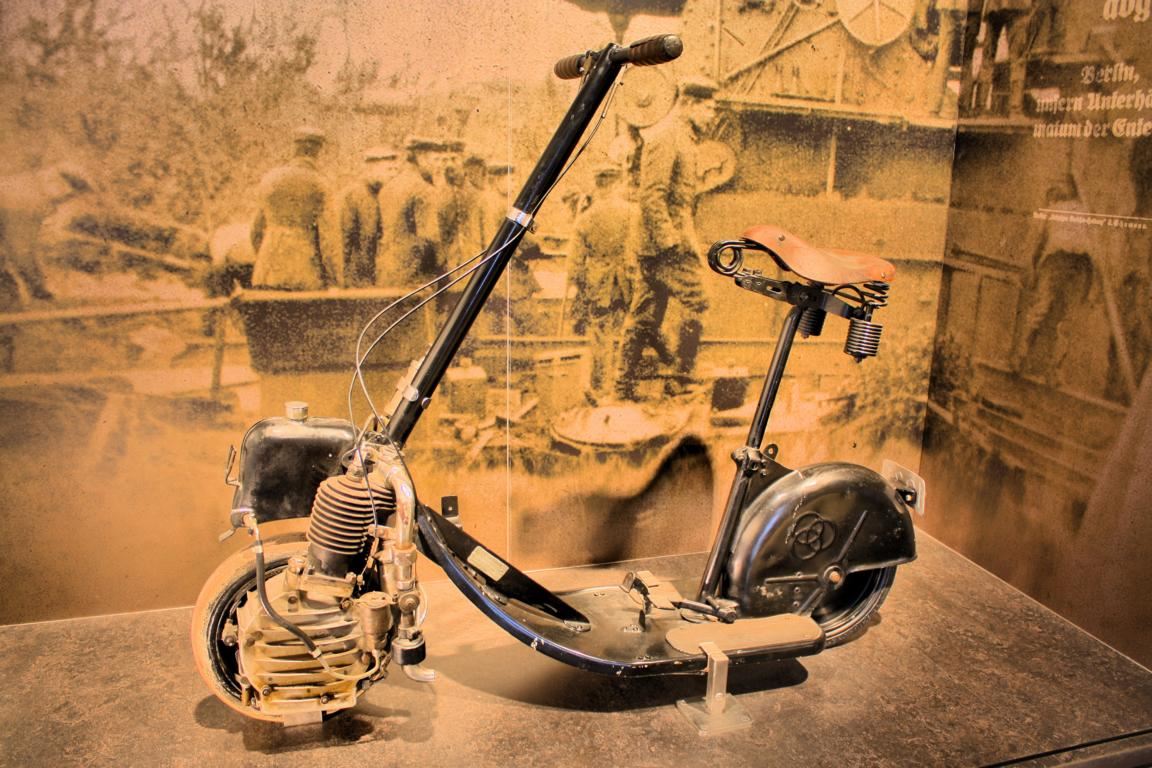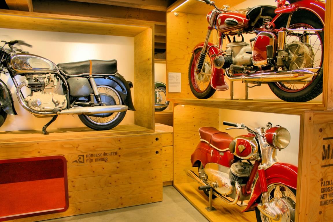 Beispielsweise wurde von den Dresdner Hainsberger Metallwerken im Auftrag der Sowjets ohne Lizenz ein Mofa produziert, dessen Motor aus einem enteigneten Sachs-Zweigbetrieb stammte. Ein besonderer Fingerzeig in einer passenden, mit Kriegslärm untermalten Abteilung ist auch das „eingemauerte Motorrad„, eine ›DKW NZ 350‹ von 1939, die der Besitzer auf diese Weise dem Zugriff des deutschen Militärs entzog. Die gezeigte Maschine ist praktisch neuwertig, da sie in Vergessenheit geriet und nur per Zufall wiederentdeckt wurde.