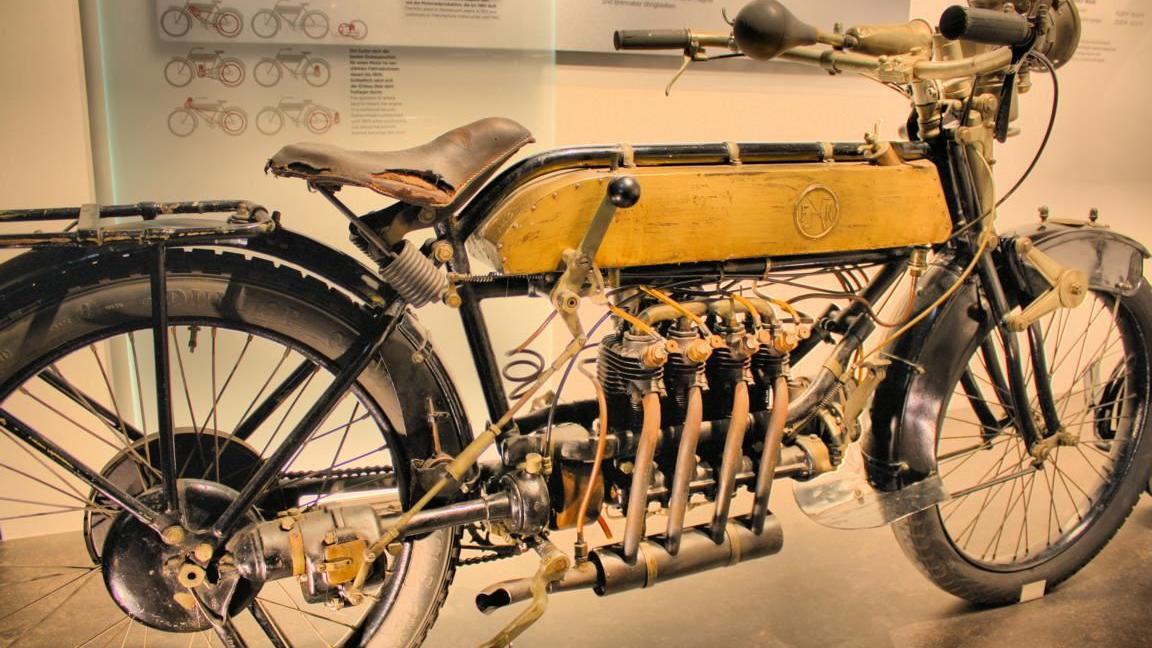 Ein ganz besonderer Hingucker ist auch die ›FN 4‹, ein Motorrad mit Vierzylinder-Reihenmotor des belgischen Unternehmens ›Fabrique Nationale‹. Die sensationelle Maschine war ihrer Zeit weit voraus. Sie besaß unter anderem keine Kette, sondern einen Wellenantrieb, um die Kraft vom Motor auf die Räder zu bringen. Mit ihrem Spritzdüsenvergaser und einer Hochspannungszündanlage von Bosch fuhr sie sehr zuverlässig. Kein Wunder, dass sie von 1905 bis 1925 unverändert gebaut wurde.