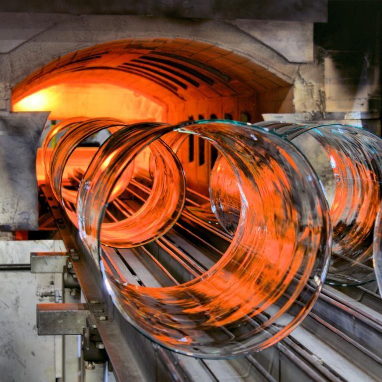 Nachdem der Zylinder geschlitzt ist, wird er langsam auf 850 Grad Celsius erhitzt. Dadurch wird er wieder formbar, was erlaubt, ihn am Ende des Ofens auf einer flachen Platte abzuwickeln.