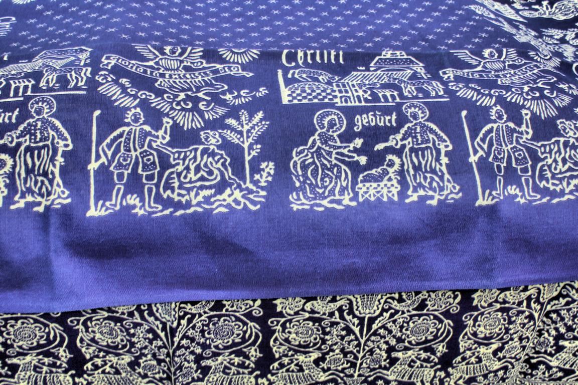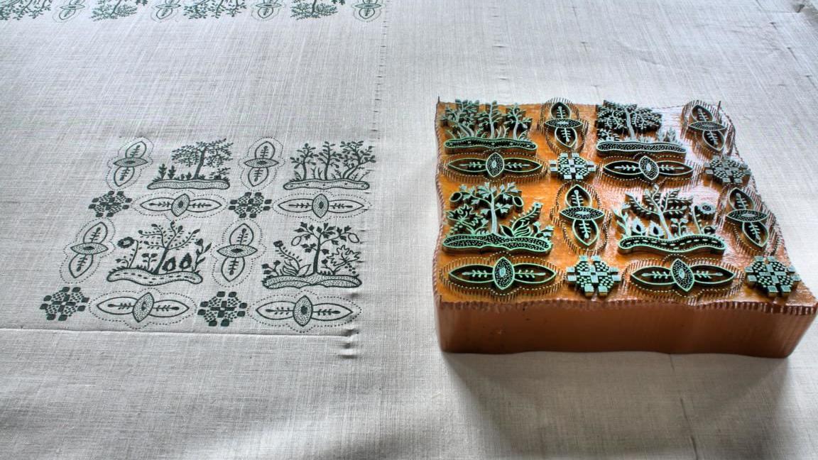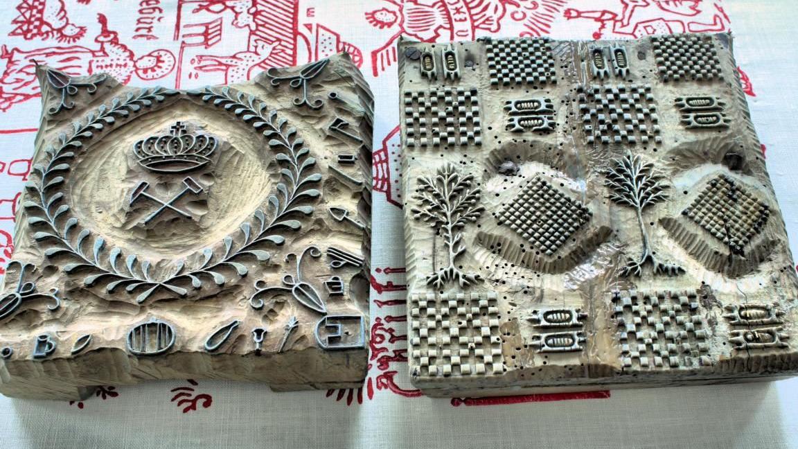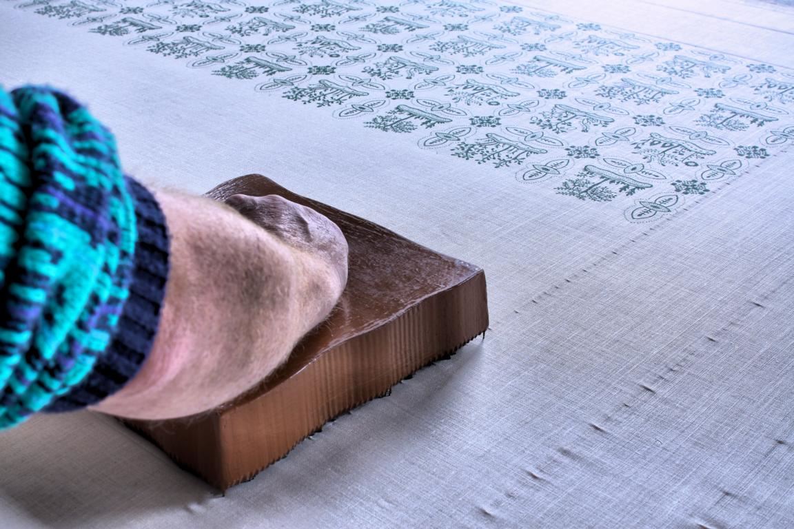 Damit die Muster akkurat in Deckung gebracht werden können, besitzen die Model an passenden Stellen einige Justierpunkte, die sich ebenfalls auf dem Stoff abzeichnen und beim Arbeiten mit den verschiedenen Modeln jeweils zur Deckung gebracht werden müssen. Auf diese Weise entsteht nach und nach eine Stoffbahn aus Leinen oder Halbleinen mit schönsten Mustern.