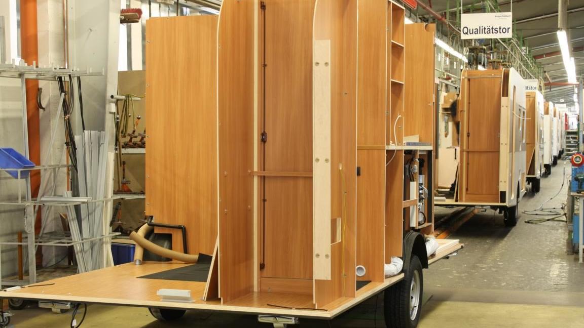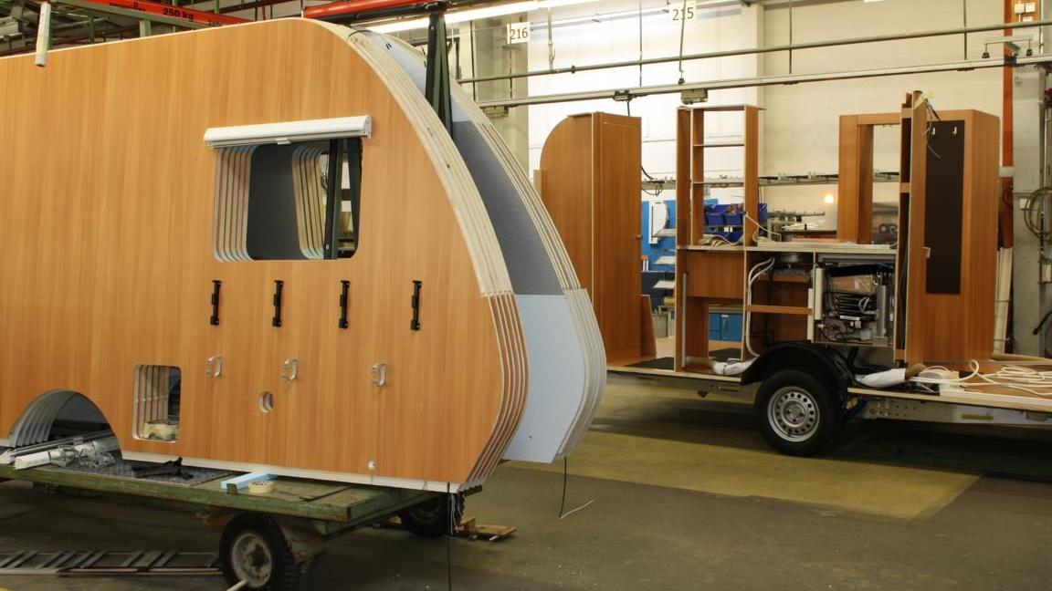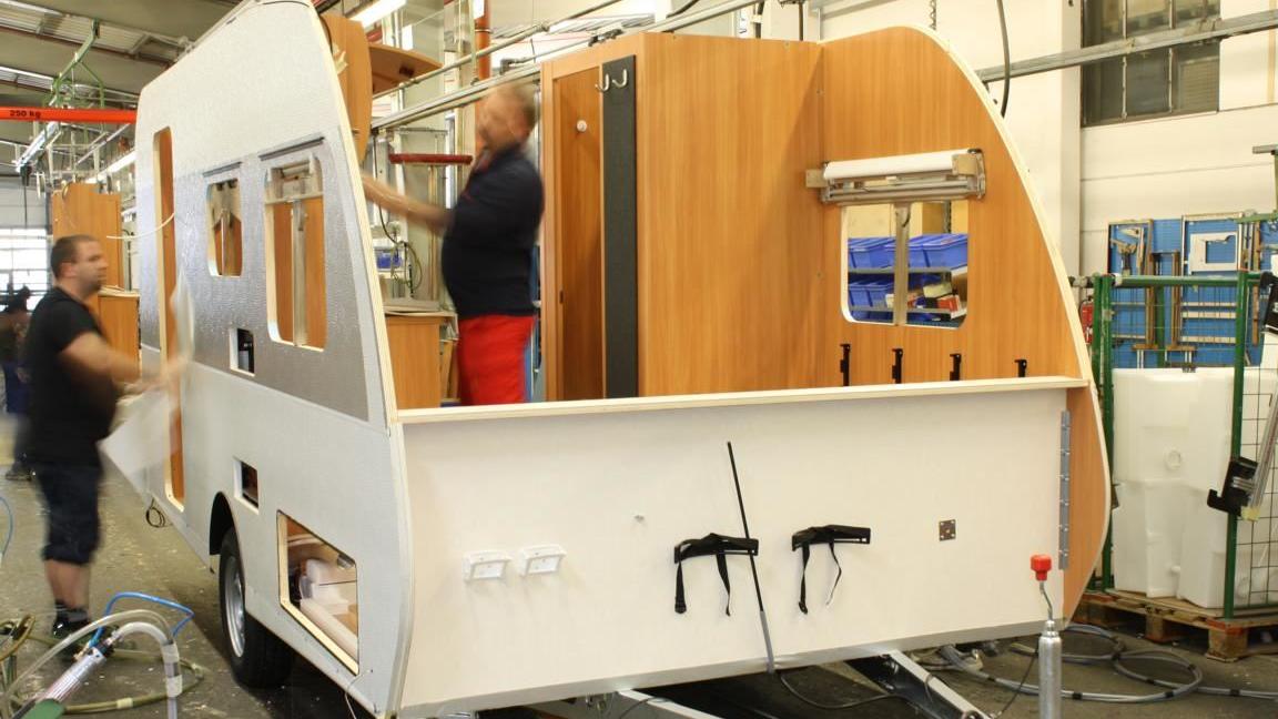 Die Produktion von Caravans und Wohnmobilen unterscheidet sich sehr von der PKW-Produktion. Was man hier schon gar nicht zu Gesicht bekommt, sind Roboter, die die Karosserie verschweißen oder Räder montieren. Dies ist auch nicht möglich, da zum einen die produzierten Stückzahlen zu gering sind, Roboter sich also nicht rechnen und zum anderen die Handarbeit in diesem Sektor nicht so einfach zu ersetzen ist. Schließlich müssen Holzrahmen sorgfältig verschraubt, verklebt oder verklammert werden.