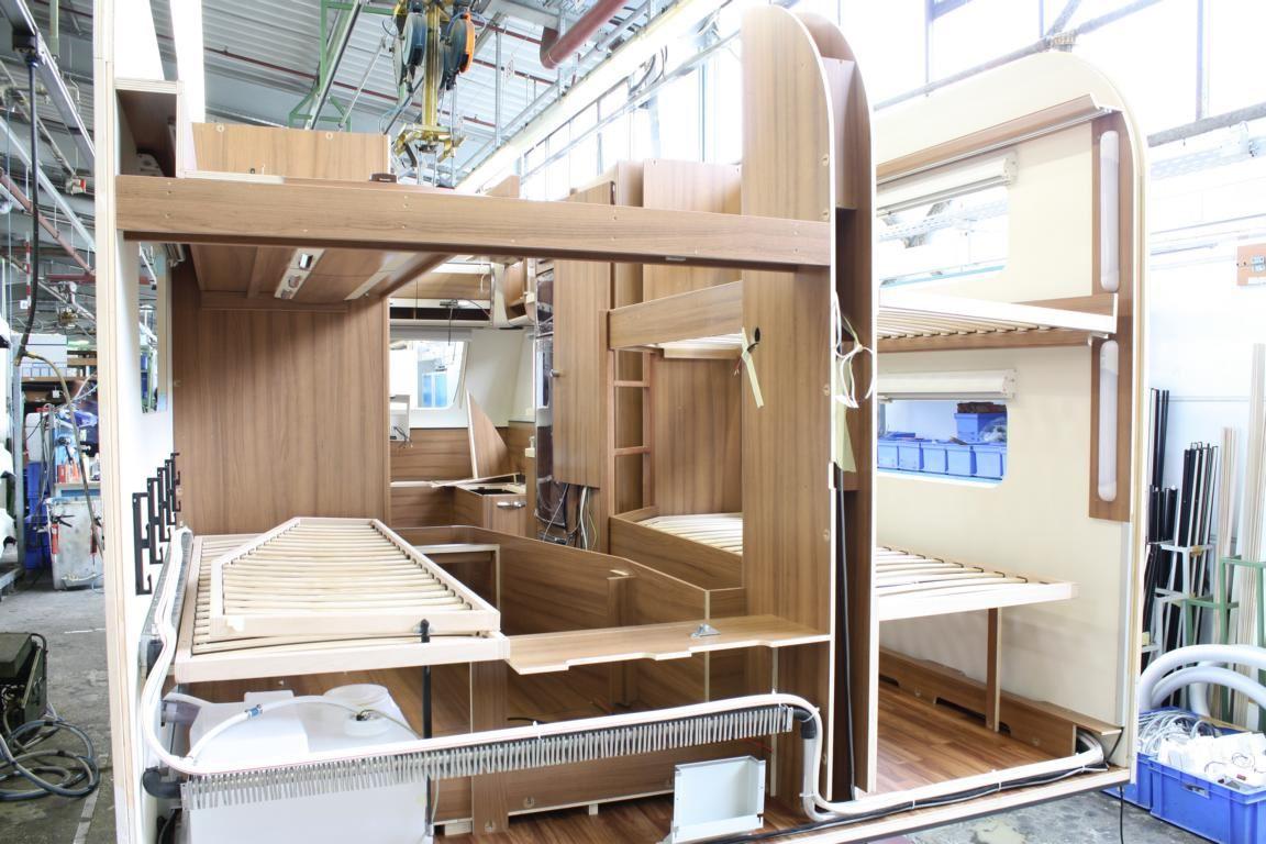 Bei dieser Menge kann man sich vorstellen, dass die Produktion straff durchorganisiert sein muss, damit die individuelle Kücheneinrichtung ebenso zur richtigen Zeit am Fließband zur Montage bereitsteht, wie die besonders gemusterten Sitzpolster, die passend zum Möbeldekor ausgesucht wurden. Je nach Marke und Grundriss vergehen lediglich zwischen 30 und 60 Stunden, bis ein neuer Caravan oder ein neues Wohnmobil fertiggestellt ist.