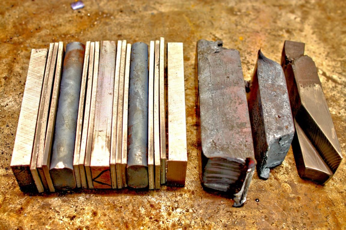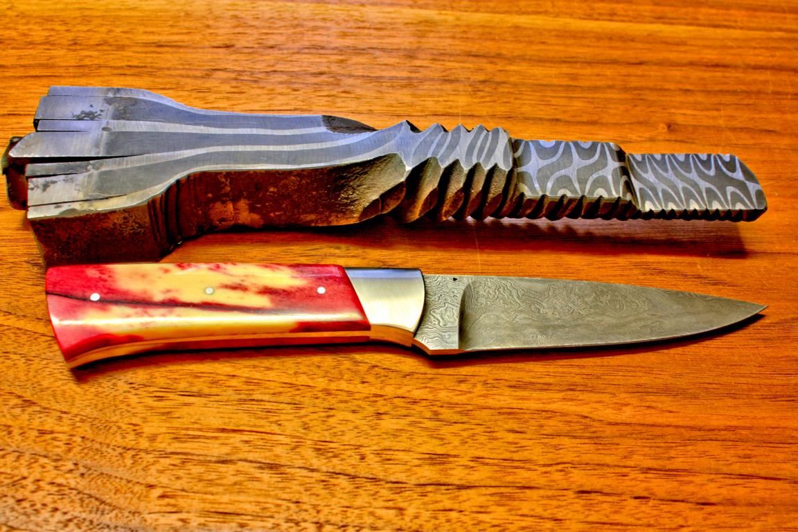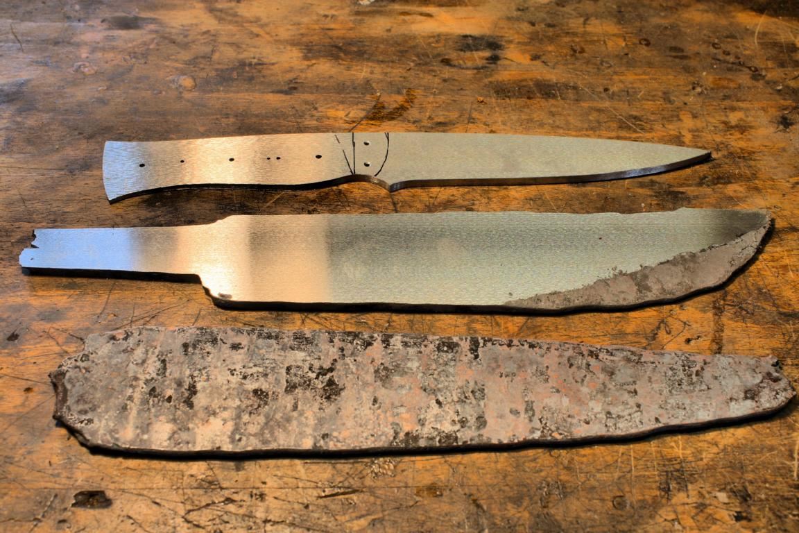 Nachdem das Stahlpaket passend geschmiedet wurde, wird der Stab in entsprechend lange Stücke zerteilt, die dann zu einer noch sehr groben Messerform ausgeschmiedet werden. Diese Messer-Rohlinge kommen anschließend auf eine Flachschleifmaschine. Hier werden sie vom Zunder befreit und eben geschliffen. Die nun blanken Rohlinge werden in diesem Stadium mit Bohrungen versehen, wenn später die Griffe vernietet werden oder erhalten am Griffstück sogar Passungen, wenn der Griff und der Messerkörper als verklebte Einheit gewünscht sind.