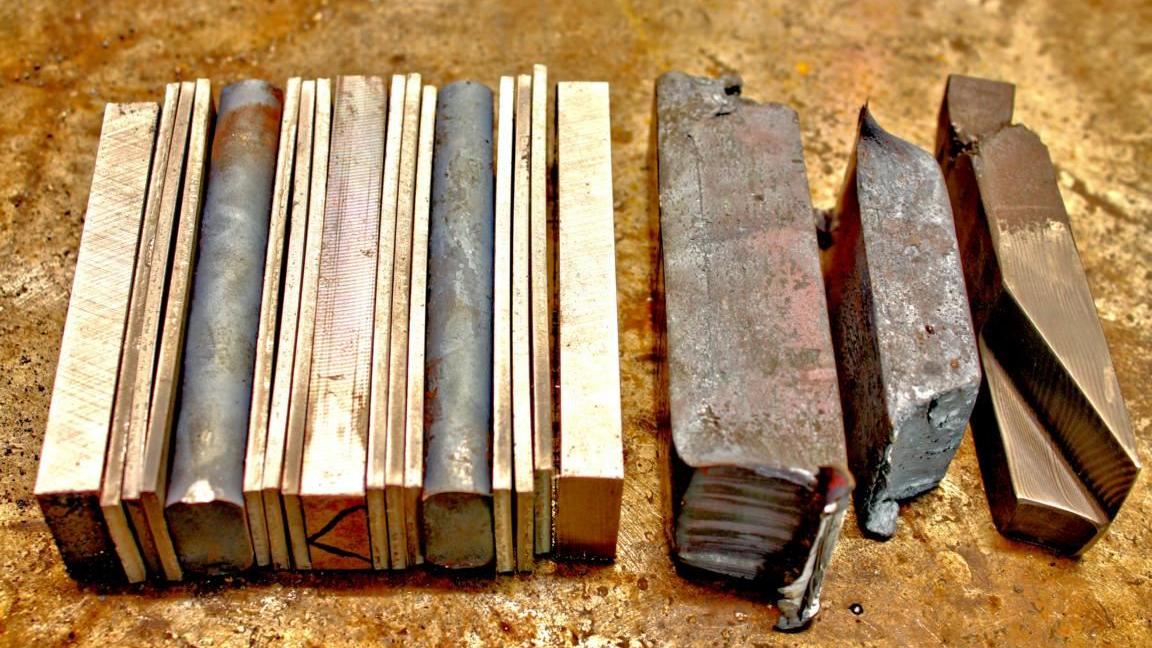 Dabei reduziert sich der Kohlenstoffgehalt, sodass aus dem Werkzeugstahl ein Vergütungsstahl wird, was für die Eigenschaften die Gebrauchsmesser aufweisen müssen, wichtig ist. Durch das Verdrehen der zusammengeschmiedeten Stahlbündel verklammern sich die einzelnen Lagen und bilden einen festen Verbund, der nicht mehr abplatzen kann. Welches Material genau verwendet wird, welche „Rezeptur“ also ihren Damaszener-Stahl ergibt, verraten die beiden Messermacher nicht, was sehr verständlich ist.