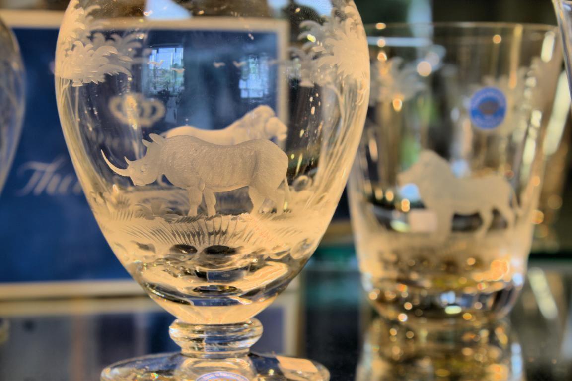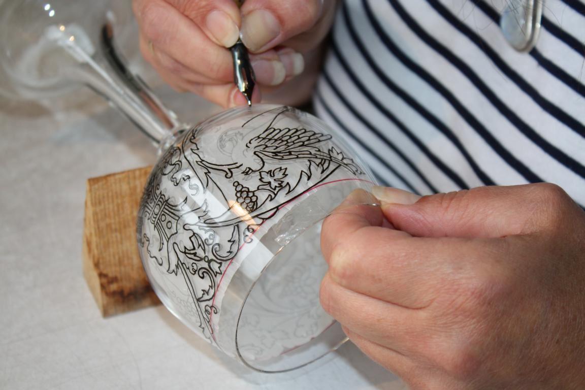 Faszinierend auch die Erkenntnis, wie es die Künstler schaffen, Gläser mit überaus detaillierten Kunstwerken zu veredeln: Sie malen auf das Glas mit einem wasserfesten Stift die Verlaufslinien der Schliffkante ein beziehungsweise bekleben die Innenseite des Glases mit einem Papierstreifen, auf dem sich die Kontur des aufzumalenden Musters befindet. Dieses Muster wird dann auf der Außenseite des Glases mit einem in Poliergold getauchten Kaligraphiestift abgepaust.