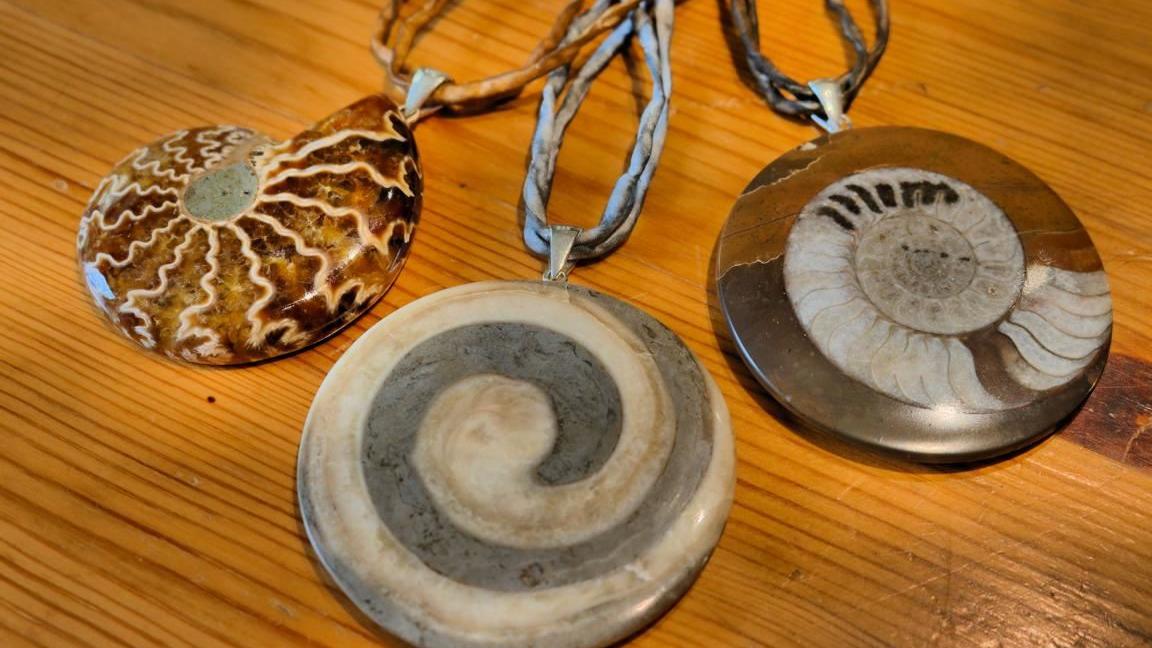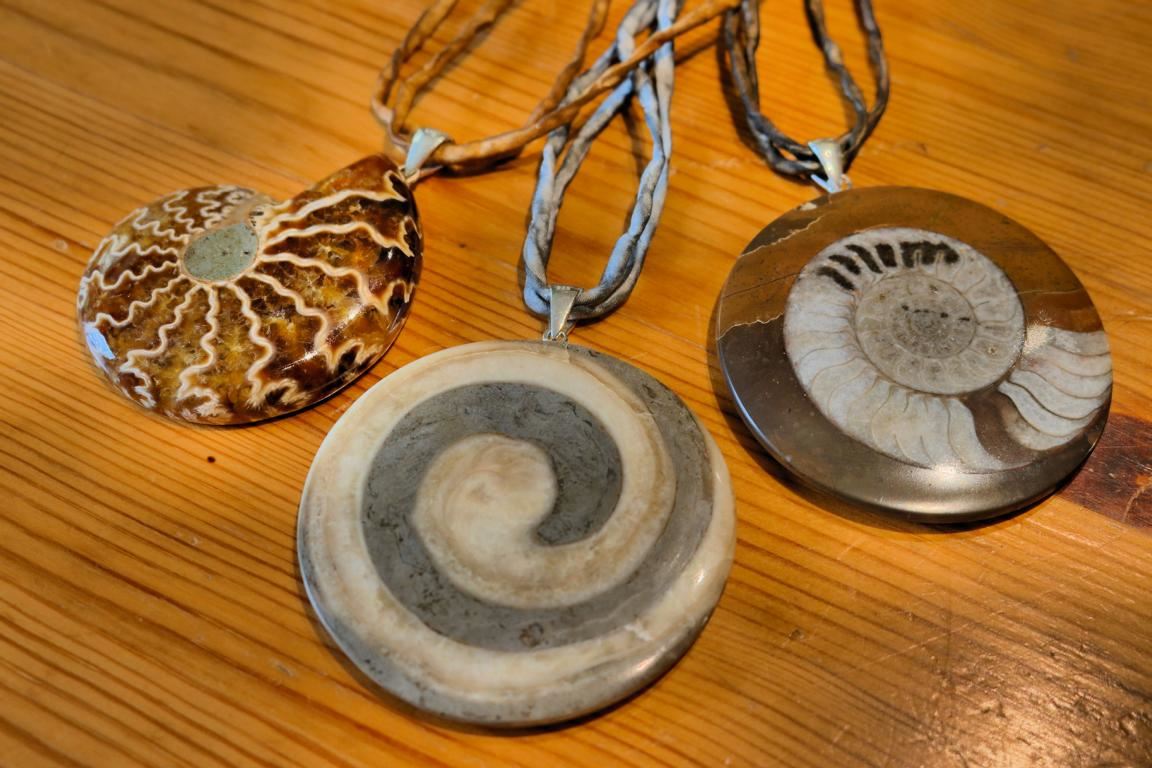 Nicht weniger beeindruckend sind steinerne Schmuckstücke, in denen Ammoniten oder Schnecken eingeschlossen sind. Ammoniten, gehäusetragende Tintenfische, lebten über einen Zeitraum von 350 Millionen Jahren und starben vor rund 66 Millionen Jahren aus. Schnecken bevölkern die Meere bis heute. Doch sind die von Dr. Wierer verarbeiteten Exemplare aus dem Salzkammergut auch schon rund 80 Millionen Jahre alt. Selbst Ziegelsteine aus dem Mittelalter eignen sich für schönen Schmuck. Der Grund liegt darin, dass damals beim Brennen manche Ziegel überhitzt wurden, was zu einem besonderen, dekorativen Schmelzgefüge führte, das durch Schleifen sichtbar gemacht werden kann.