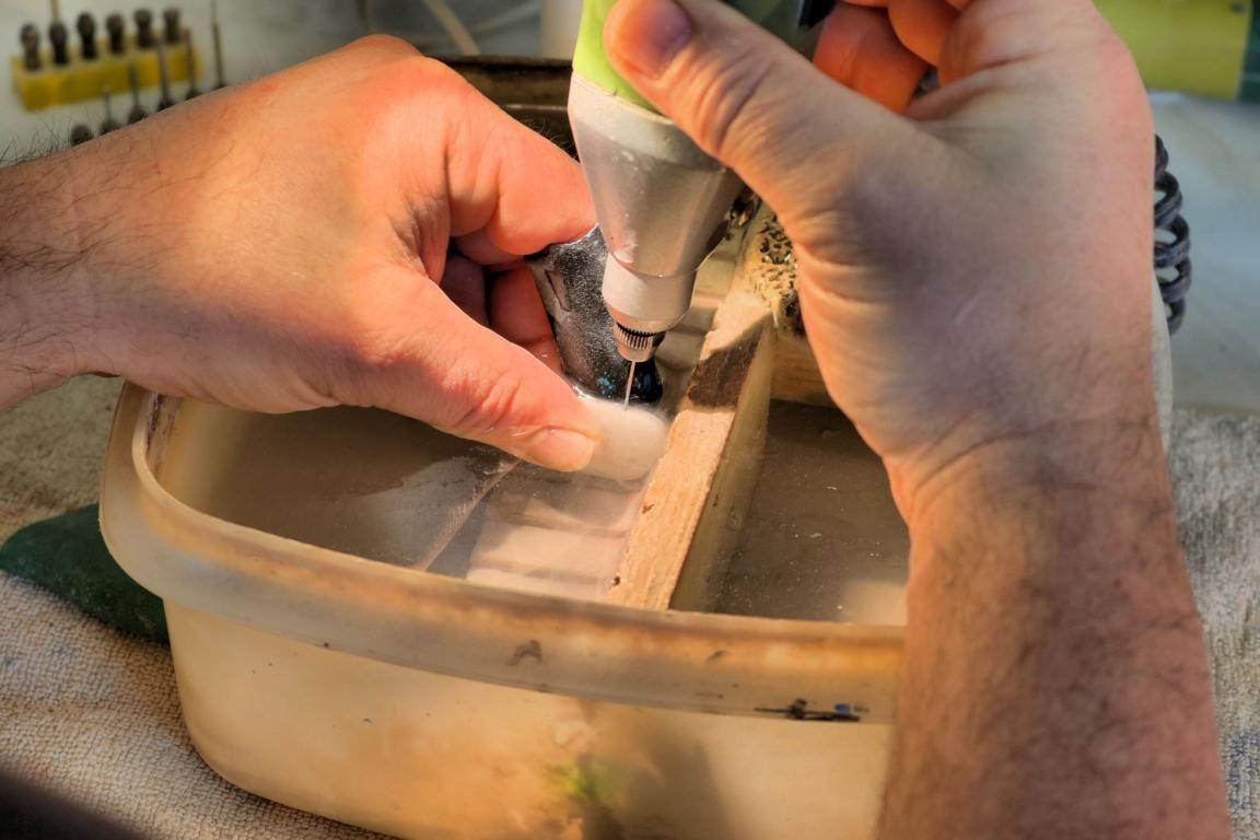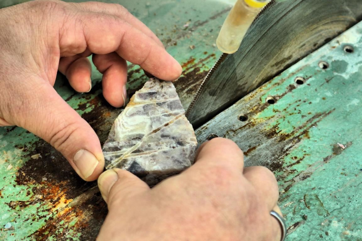 Wer nun Feuer gefangen hat, sich einem neuen, hochinteressanten Hobby zuzuwenden, kann sich von Dr. Wierer in die Tiefen des Steinschleifens einführen lassen. Hier wird unter anderem gelernt, dass sich zwar die meisten Steine mit einem wassergekühlten, diamantbestückten Sägeblatt trennen lassen, einige besonders zähe Schmucksteinarten aber eine langsam laufende, schneidölgekühlte Säge erfordern.