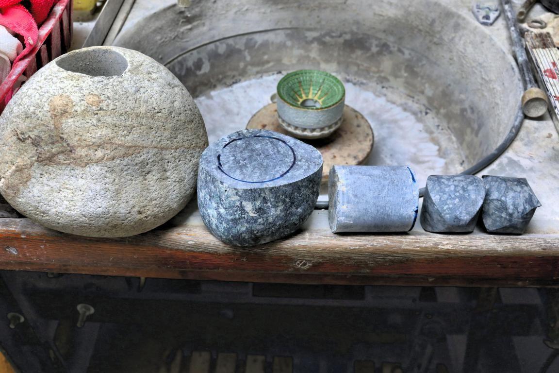 Schon die Art und Weise, wie aus einem unförmigen Gesteinsbrocken eine oder mehrere Kugeln entstehen, lassen den Laien staunen: Mit einem diamantbesetzten Hohlbohrer wird aus dem rohen Stein ein Zylinder herausgebohrt, der anschließend mit dem gleichen Hohlbohrer im 90 Grad Winkel zur Zylinderachse nochmals angebohrt wird. Nach dem Vorschleifen auf einer Tischschleifmaschine wird dieser Rohling auf einer extra dafür ausgelegten, 700 Kilogramm schweren Schleifmaschine in Kugelform gebracht. Den Abtrag überschüssigen Materials übernehmen dabei hohlkegelige Schleiftöpfe.