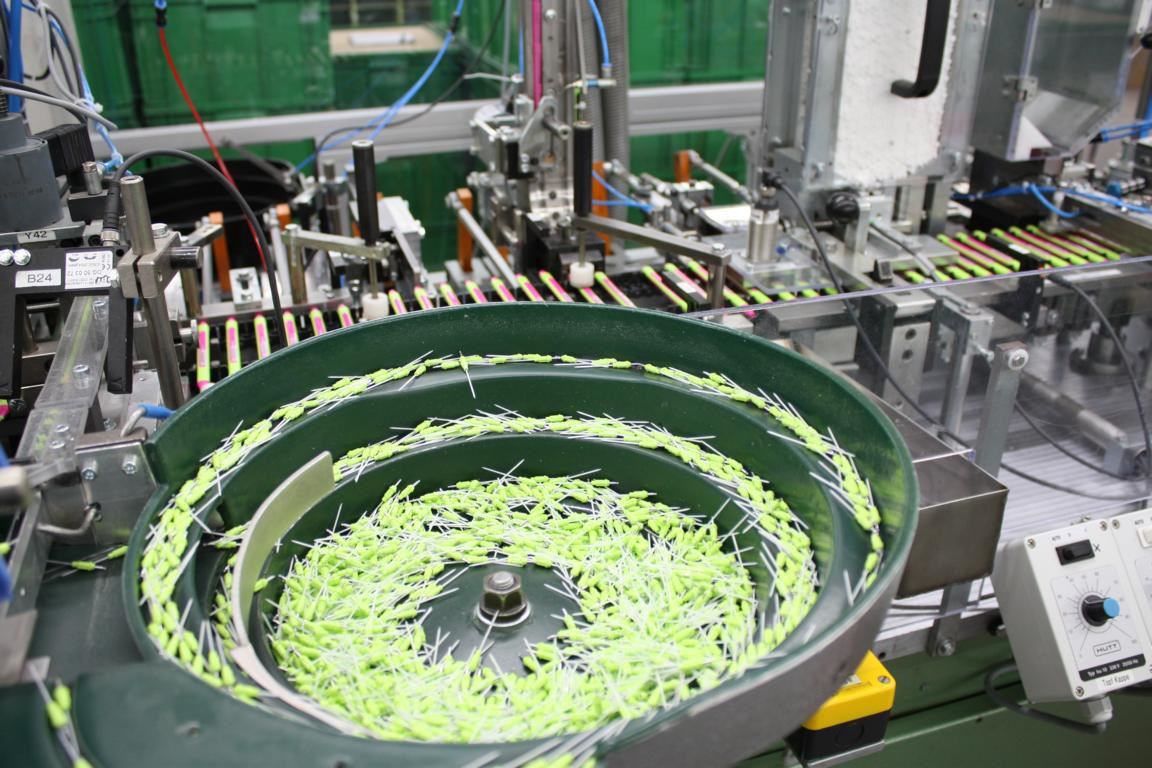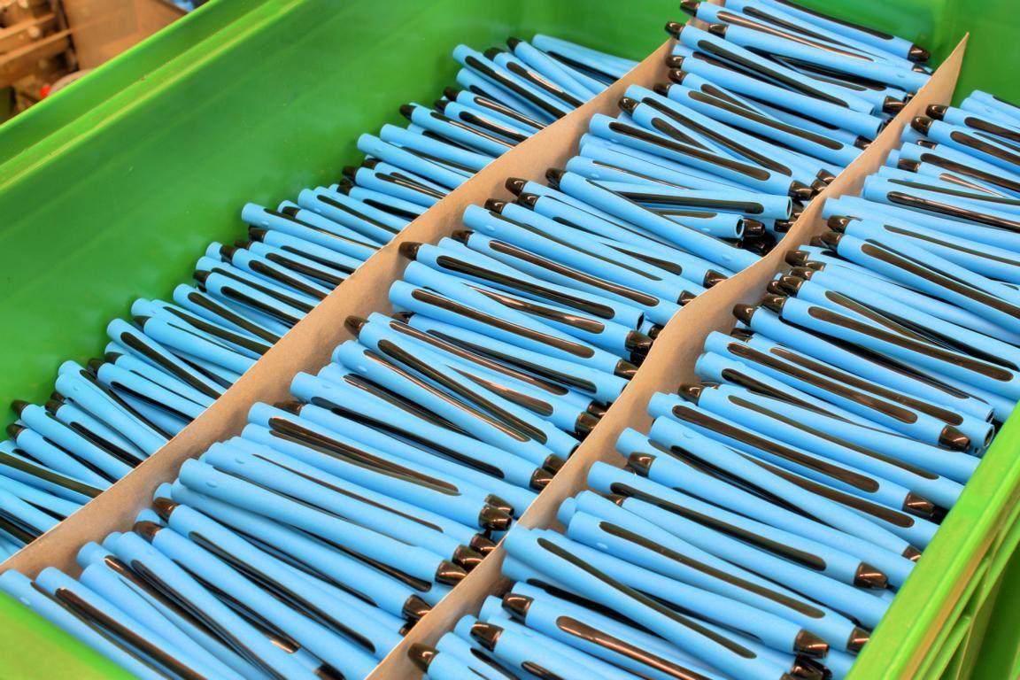In diesem Prozess kommt ein hochwertiger Maschinenpark zum Einsatz, der von bestens ausgebildeten Fachleuten bedient wird. Neben unzähligen Kugelschreibermodellen produziert der Vollsortimenter zusätzlich Textmarker, Fineliner, Füller, Patronenroller und Faserschreiber. Rund drei Millionen Schreibgeräte werden täglich aus überwiegend selbst produzierten Einzelteilen vollautomatisch zusammenmontiert.