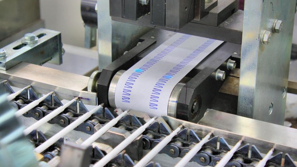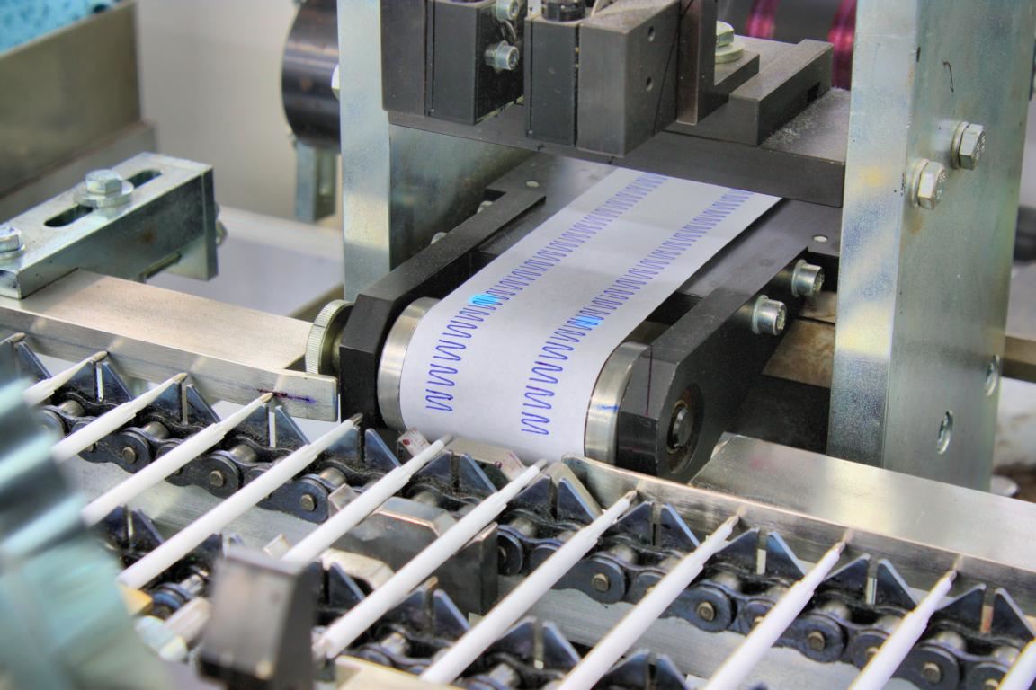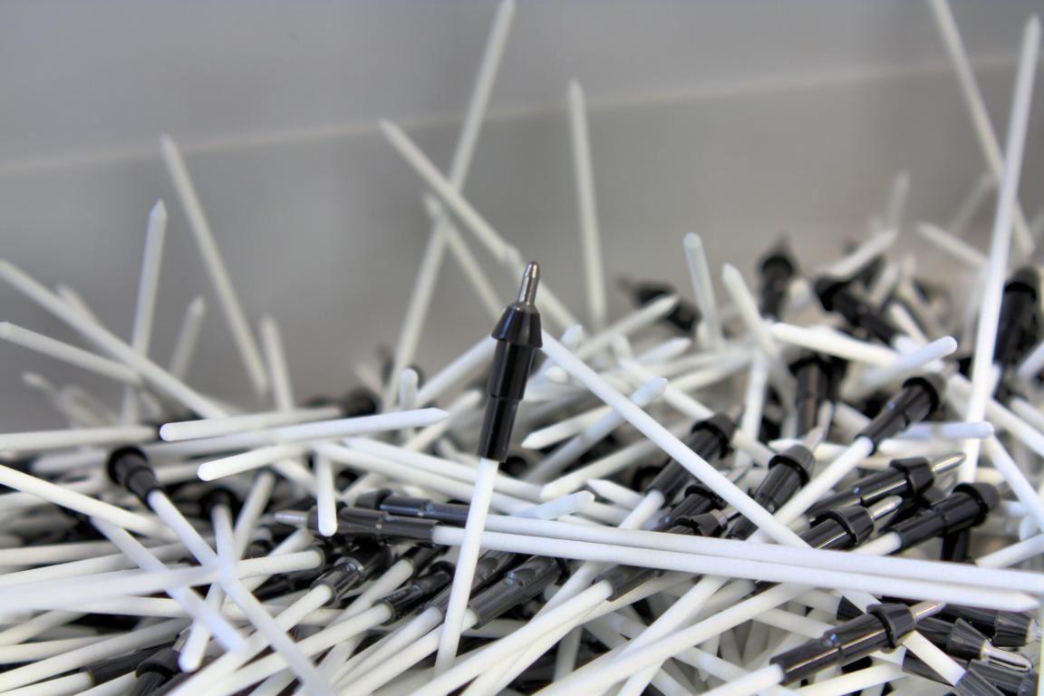 Bei allen Kugelschreibermodellen sorgt eine innovative Auswerteelektronik dafür, dass Exemplare ausgesondert werden, die nicht mit dem ersten Strich zuverlässig Tinte aufs Papier bringen. Auch Luftbläschen in der Paste können zum Aussetzten des Schreibflusses führen. Damit eingeschlossene Luft daher den Tintenfluss nicht unterbricht, werden die fertig montierten Kugelschreiberminen in einer Zentrifuge geschleudert, und die Luft herausgedrückt. Dieser Vorgang erfolgt ebenfalls automatisch.