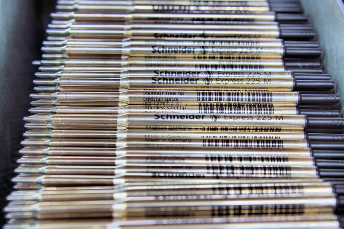 Ebenso flott geht es beim Bedrucken der Schreibgeräte beziehungsweise der Minen zu. Per Sieb- oder Tampondruck werden feinste Schriftzüge und Logos auf die teils winzigen Flächen aufgetragen. Außerdem beherrscht Schneider das Thermotranferverfahren, mit dem Dekorfolien auf die Minen oder Kugelschreiber aufgetragen werden, die Bilder und Logos oder Infos zur Kugelschreibermine enthalten. Dies wird derart exakt vorgenommen, dass mit dem freien Auge keine Trennlinie erkennbar ist und der Eindruck eines Rörchens entsteht, das über die Mine gesteckt wurde.