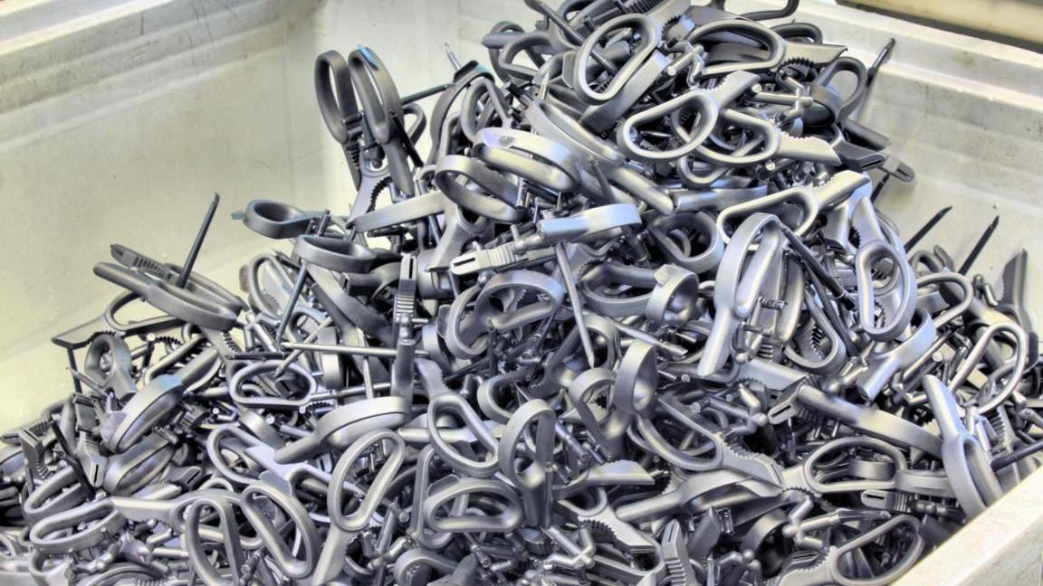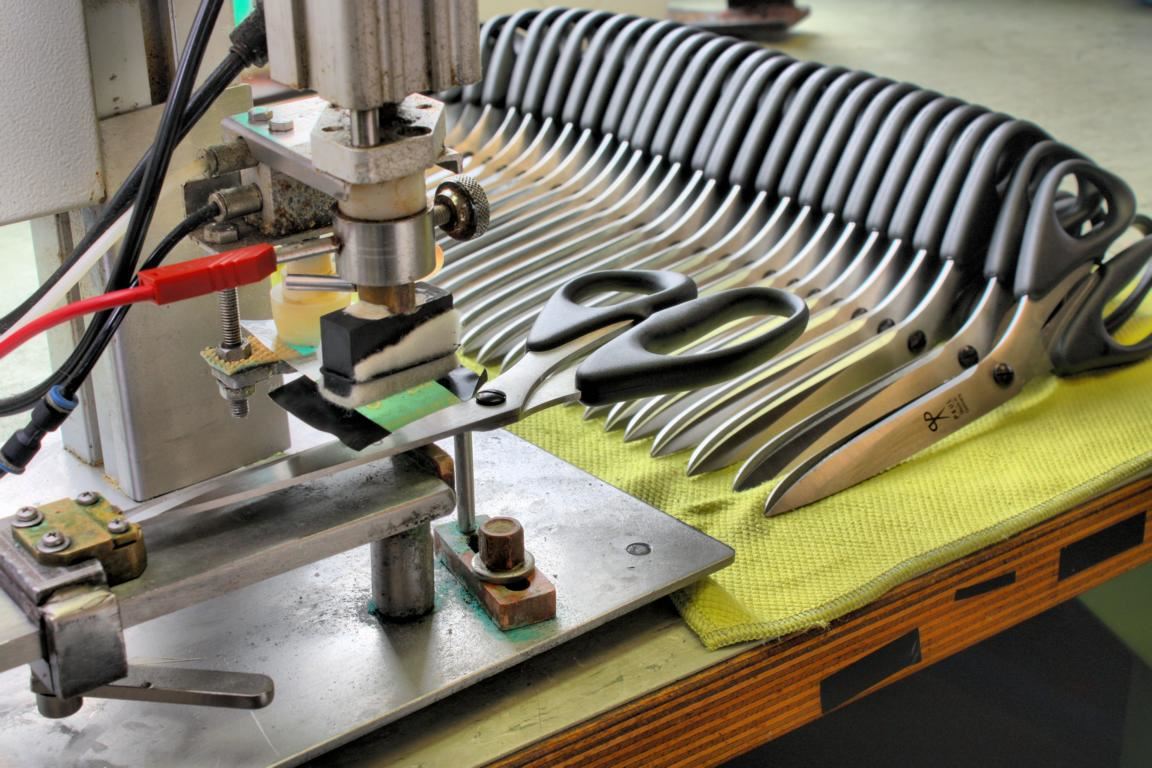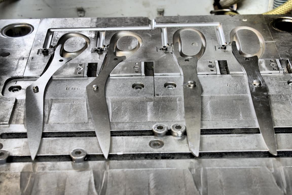 Scheren für anspruchsvollere Schnittarbeiten bekommen hingegen einen angespritzten Griff, wozu im Unternehmen Spritzgießmaschinen von Arburg und Battenfeld im Einsatz sind. In diesem Prozess wird Kunststoffgranulat bei 280 Grad Celsius verflüssigt und mit 100 bar Druck in die Spritzgießform eingespritzt. Damit die beiden Formhälften während dieses Vorgangs durch den hohen Einspritzdruck nicht aufgedrückt werden, wirkt ein Gegendruck von 100 Tonnen auf die beiden Werkzeughälften.