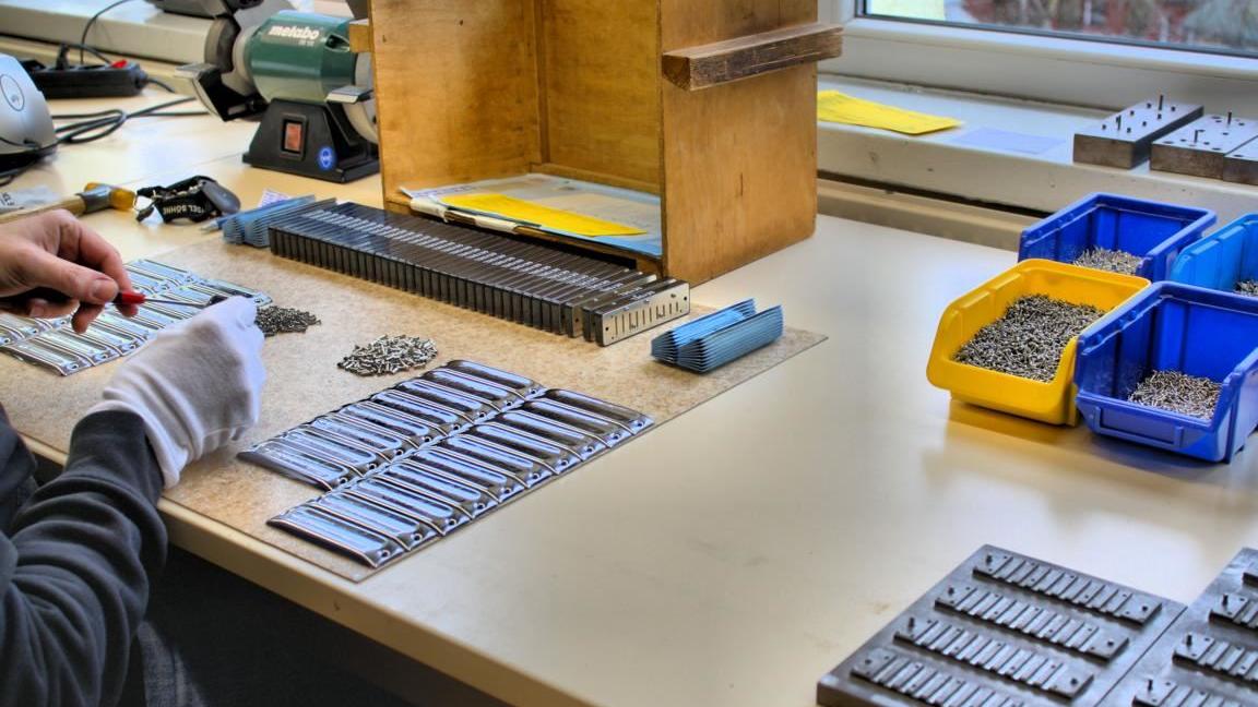 Doch auch für das Auge wird viel geboten. Seydel-Mundharmonikas entstehen in reiner Handarbeit. Dadurch ist eine besonders schonende Produktion der einzelnen Bauteile gewährleistet. Mit Hingabe werden Bleche ausgestanzt sowie umgebogen, jeder Grat entfernt und die Einzelteile akkurat montiert. Dennoch dauert trotz dieser begeisternden Produktionsweise die Herstellung einer Mundharmonika keine Ewigkeit. Je nach Modell müssen gerade einmal 20 Minuten bis maximal zwei Stunden Fertigungszeit eingeplant werden, ehe eine neue Mundharmonika das Licht der Musikwelt erblickt.