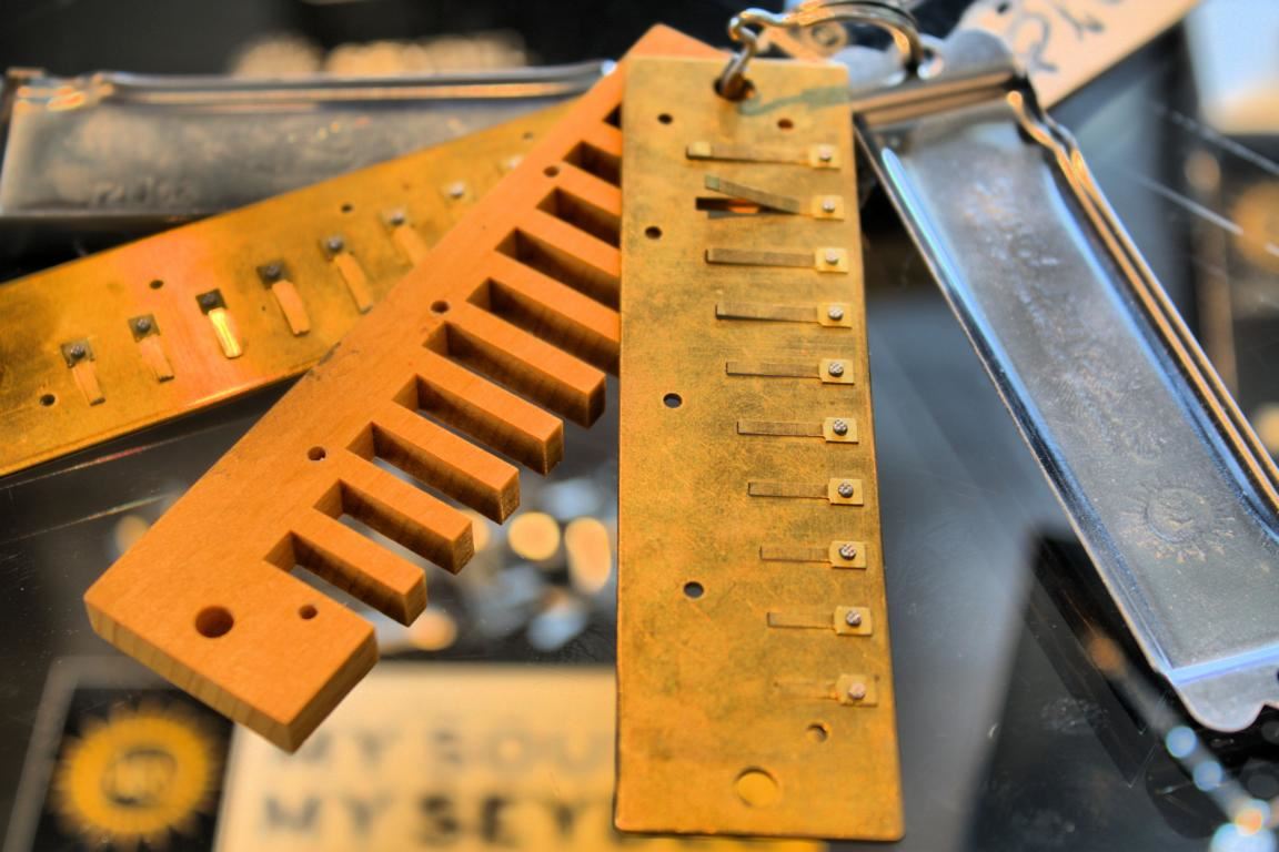 Damit nicht genug: Die einzelnen Stimmzungen müssen ein ganz bestimmtes Profil aufweisen, damit der Ton harmonisch klingt. Dieses Profil wird mittels einer Flachschleifmaschine in einen Messing- oder Niro-Blechstreifen eingebracht und dieser anschließend mittels einer Stanzmaschine in die einzelnen Stimmzungen zerteilt.
