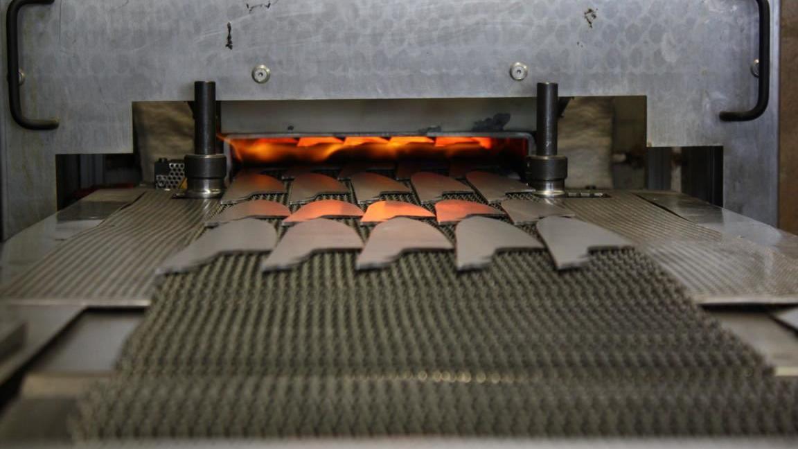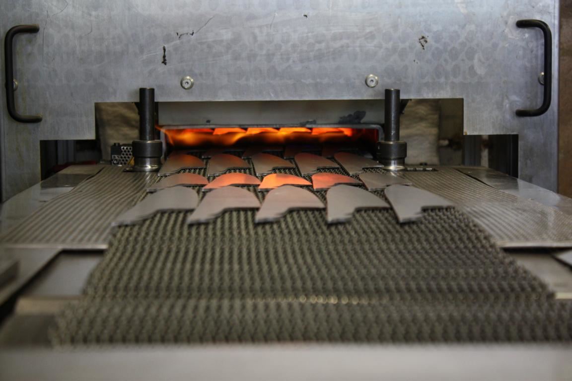 Dieser Stahl wird in eigenen Härteöfen auf 1.060 Grad Celsius erhitzt, anschließend in Öl abgeschreckt und danach nochmals auf 180 Grad Celsius erwärmt, was als ›Anlassen‹ bezeichnet wird. Dadurch erhält die Messerklinge eine hohe Härte von 56 HRC, die mit großer Zähigkeit einhergeht, was zum Wegstecken seitlicher Krafteinwirkung wichtig ist.