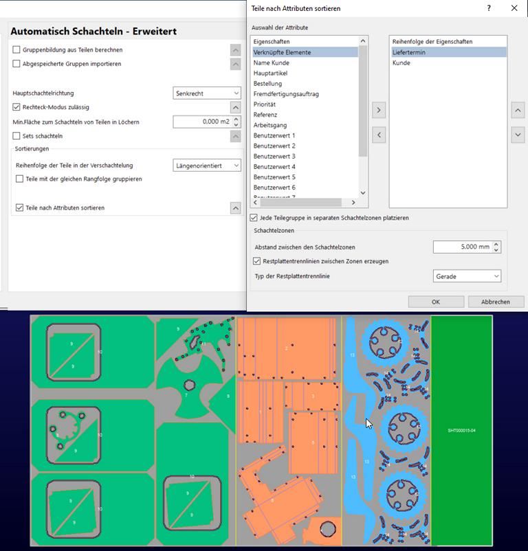Mit der neuen Funktion können im Schachtelvorgang Teile auf einem Blech oder in einem Bereich des Blechs nach bestimmten Kriterien zusammengefasst und geordnet werden. Neben der farblichen Kennzeichnung zusammengehörender Werkstücke können nun zur Orientierung der Mitarbeiter ein Versatz und auch Trennlinien zwischen Teilegruppen erzeugt werden. Zur Nutzung der neuen Funktion können Anwender Teile nach beliebigen Zusatzinformationen auswählen, die bei der Erfassung von Aufträgen in Lantek Expert oder Lantek MES abgespeichert werden – etwa Lieferfristen, nachfolgende Arbeitsschritte, Ladungsträger oder Zugehörigkeit zu einer Bestellung oder Baugruppe. Bei der Schachtelung einer Platte werden dann Teile dieser Eigenschaft priorisiert und alle anderen nachrangig betrachtet.