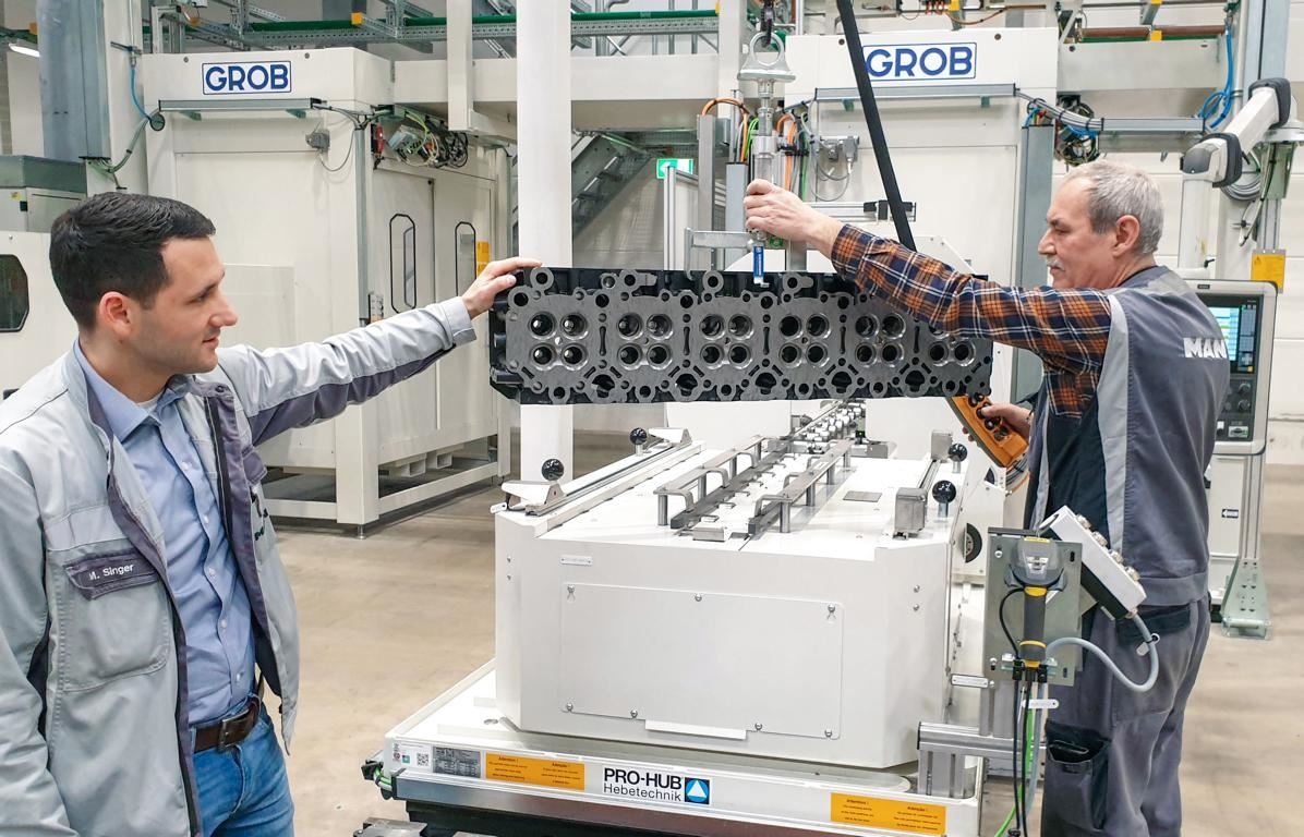 Die sechs Zylinder des Motors haben jeweils zwei Ein- und Auslassventile, in die Zylinderkopfbank müssen also 24 Bohrungen eingebracht werden. Da die Durchmesser von Ein- und Auslass variieren, sind für deren Bearbeitung Werkzeuge unterschiedlicher Größe erforderlich. Die Bearbeitung findet auf einer Doppelspindelmaschine statt. Sie ist eingebettet in eine verkettete Anlage mit Einzelmaschinen von Grob, die durch Linearportale beladen werden.