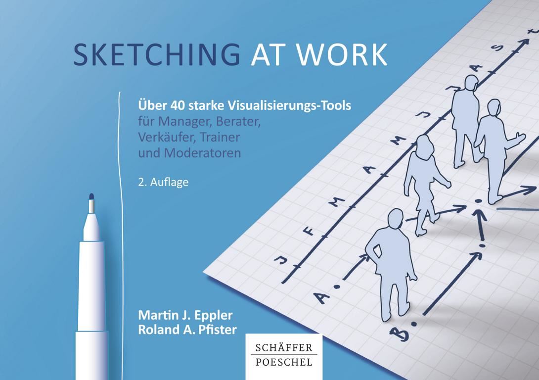 Martin J. Eppler und Roland A. Pfister geben in ihrem Buch › Sketching at Work‹ zahlreiche Tipps und präsentieren Vorlagen, mit denen es möglich wird, Ideen auszudrücken und innovativ zu sein. Das Buch ist ein echter Kreativitätsförderer und sollte auf keinem Schreibtisch fehlen. Wer sich mit dessen Inhalt auseinandersetzt, wird Folien und Powerpoint wohl nur mehr selten beim Präsentieren oder beim Erarbeiten von Lösungen aller Art einsetzen, da es mit Skizzen weitaus einfacher und präziser wird, zu kommunizieren. Die Chance ist groß, dass sich durch den Einsatz von Skizzen langweilige Sitzungen in engagierte Treffen mit hohem Kooperationsgrad verwandeln.