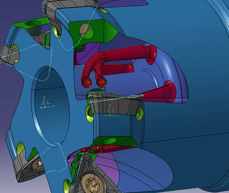 Doch ISCAR wäre nicht ISCAR, wenn der Werkzeugspezialist die Kühlung nicht noch weiter verbessert hätte – schließlich steht hier die Entwicklung niemals still: „Im nächsten Schritt haben wir die Kühlmittelkanäle in den Fräsköpfen strömungsoptimiert und den nutzbaren Kühlmitteldruck weiter maximiert“, erklärt Anton Kress. Für eine höhere Austrittsgeschwindigkeit ist der zentrale Kühlmittelzufluss nun trichterförmig angelegt und verjüngt sich im Übergang zu den einzelnen Kühlmittelkanälen, die zu den Schneiden führen. Die nur einen Millimeter durchmessenden Leitungen verlaufen jetzt in weichen Bögen mit großen Radien, Geraden gibt es nur noch direkt vor dem Auslass, um das KSS zielgenau an die Schneide zu transportieren. „So konnten wir den Volumenstrom verdoppeln und die Austrittsgeschwindigkeit sowie den KSS-Druck an der Schneide vervielfachen.“