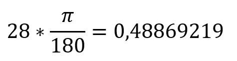 Soll beispielsweise der Winkel von 28 Grad in Bogenmaß umgerechnet werden, so ergibt sich folgendes Ergebnis: