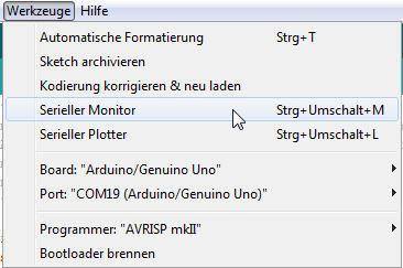 Der Arduino bringt von Haus aus einen emulierten Monitor mit, auf dem sich beispielsweise Texte und Rechenergebnisse darstellen lassen. Dadurch kann auf den Einsatz einer externen LCD-Anzeige verzichtet werden. Dieser Monitor wird über das Menü ›Werkzeuge‹ unter dem Menüpunkt ›Serieller Monitor‹ oder über die Tastenkombination STRG+SHIFT+M aufgerufen.