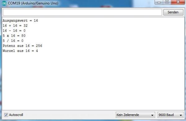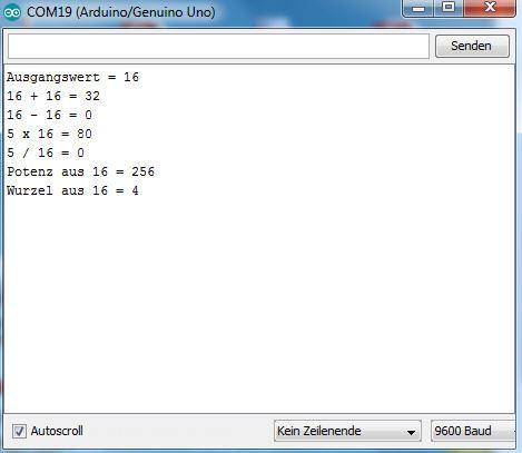 In der Variablen ›zahl‹ befindet sich nun die Zahl 16, die als Integerzahl definiert wurde. Mit dieser Zahl lassen sich die im Arduino implementierten mathematischen Funktionen testen. Damit die Ergebnisse auf dem Monitor mitgelesen werden könne, muss dieser zunächst initialisiert werden, was wie folgt geschieht: