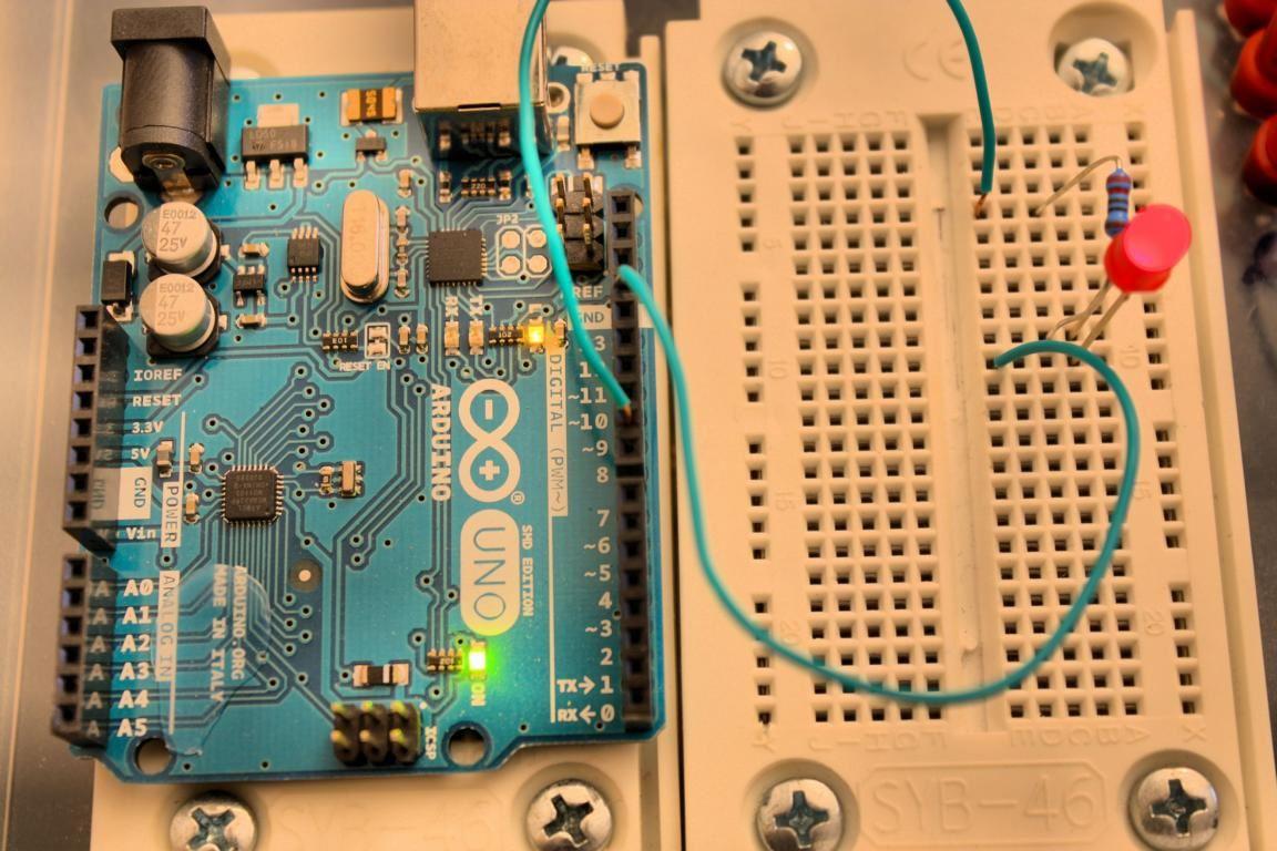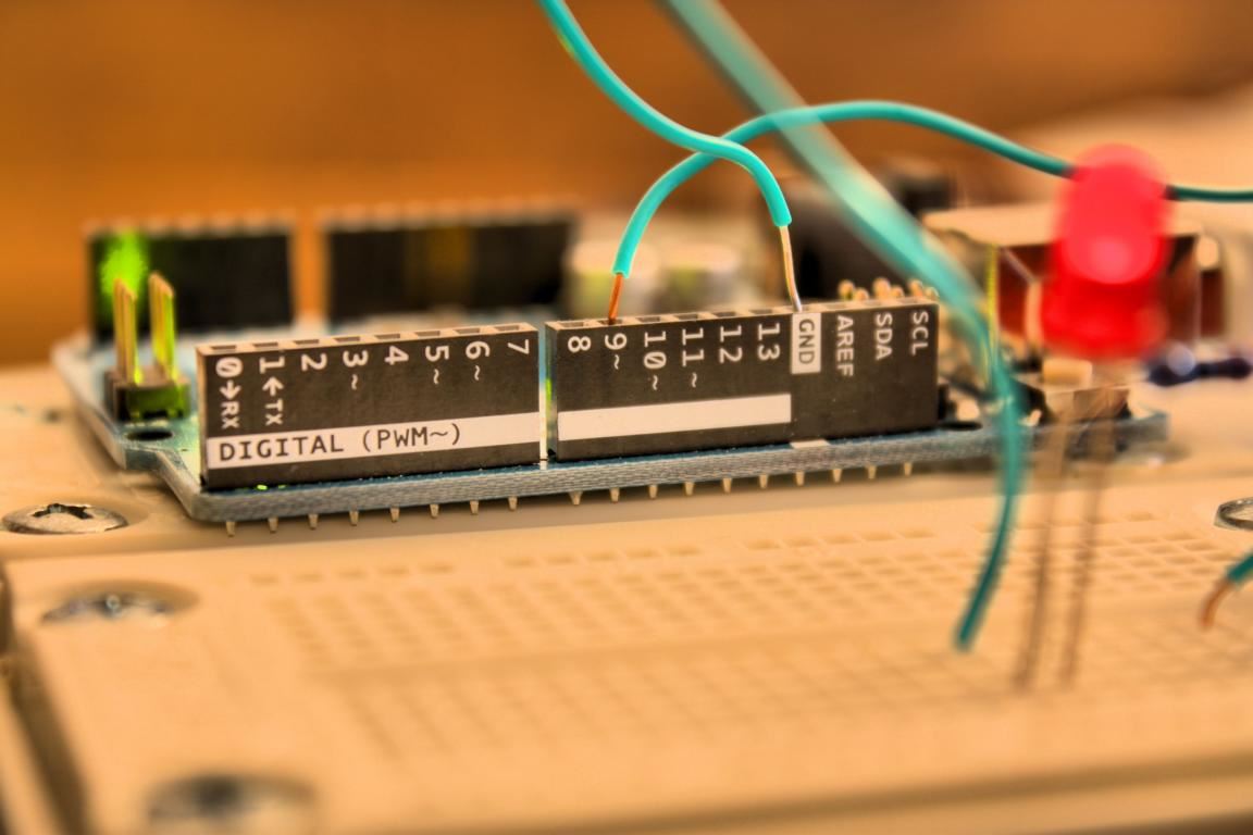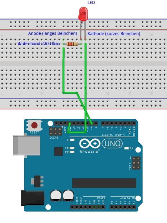 Nicht immer ist dies gewünscht. Soll beispielsweise eine LED mit geringerer Leuchtkraft einen Status anzeigen, so kann dies automatisiert nur mithilfe eines Kleincomputers erfolgen, der in der Lage ist, ein sogenanntes PWM-Signal (Pulsweitenmodulation) zu erzeugen. Dazu zählt der Arduino, der mehrere Pins besitzt, die in der Lage sind, PWM-Signale auszugeben. Dazu zählen die Pins 3, 5, 6, 9, 10 und 11.