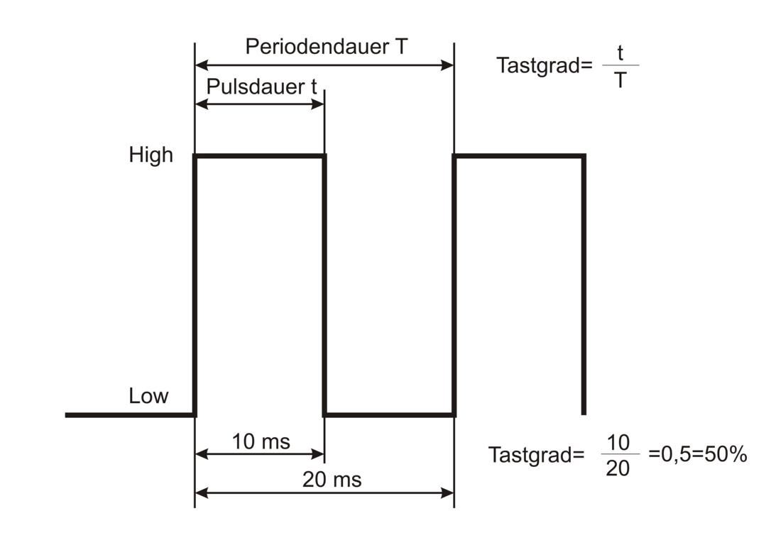 Findige Köpfe haben jedoch eine Lösung entdeckt, wie es möglich wird, eine LED zu dimmen oder einen Motor regelbar laufen zu lassen: Sie variieren die Dauer des High-Signals und legen zudem fest, nach welcher Zeit dieses High-Signal wieder verlöschen muss, respektive, wie lange das Low-Signal dauern darf, bis die Zeit der festgelegten Periodendauer abgelaufen ist und eine neue Periode mit dem Erscheinen des High-Signals zu beginnen hat.