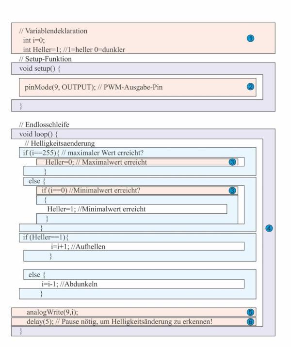 Ein Programm zum Dimmen einer LED könnte wie folgt aussehen: