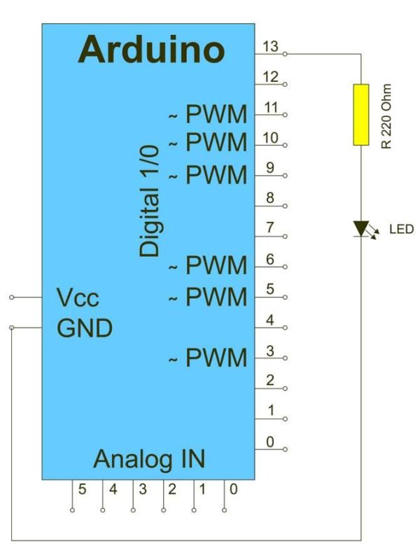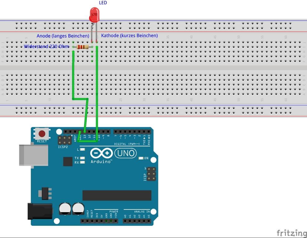 Wird eine LED an Pin 13 angeschlossen, so sieht das für den Aufbau nötige Programm (Sketch) wie folgt aus: