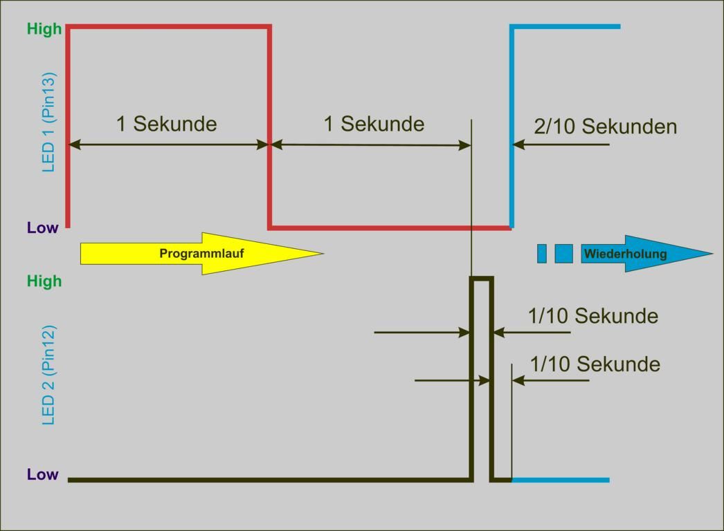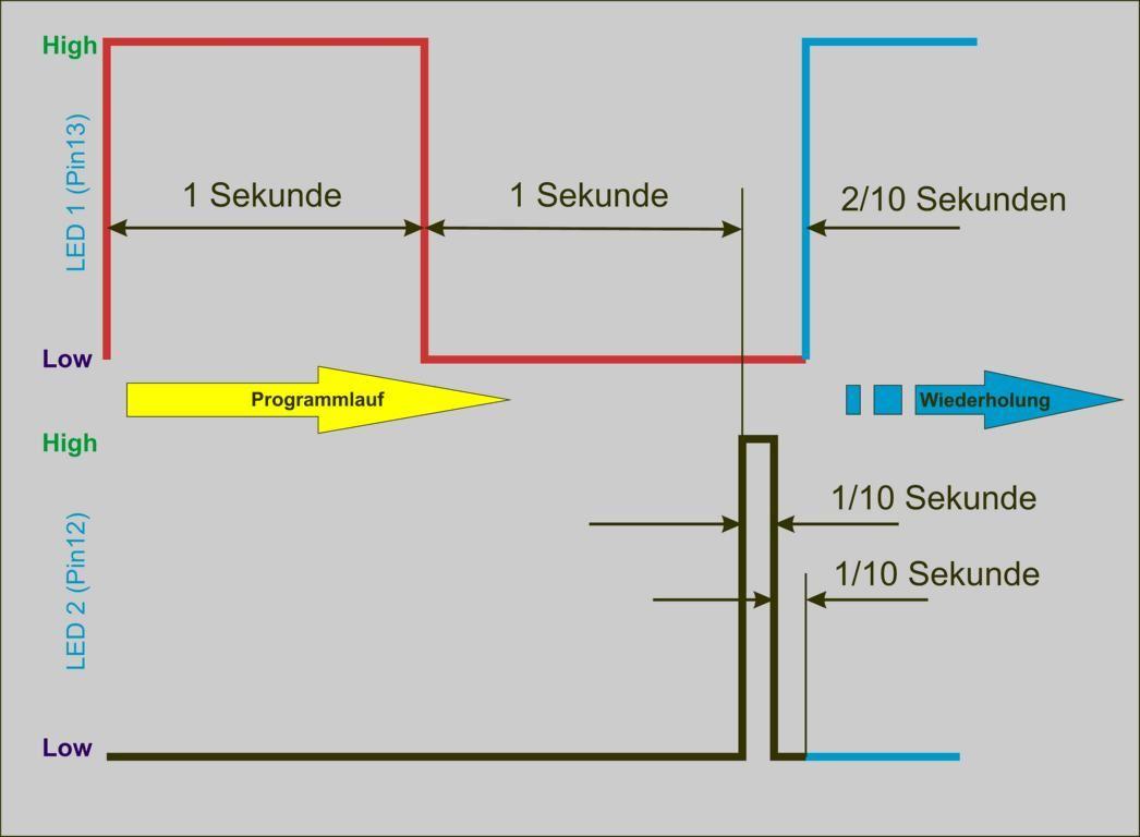 Von der Überlegung her, sollte Folgendes eintreten: Die LED an Pin 13 sollte eine Sekunde leuchten und eine Sekunde dunkel bleiben. Die LED an Pin 12 hingegen sollte eine Zehntelsekunde leuchten und ebenso lange dunkel bleiben.