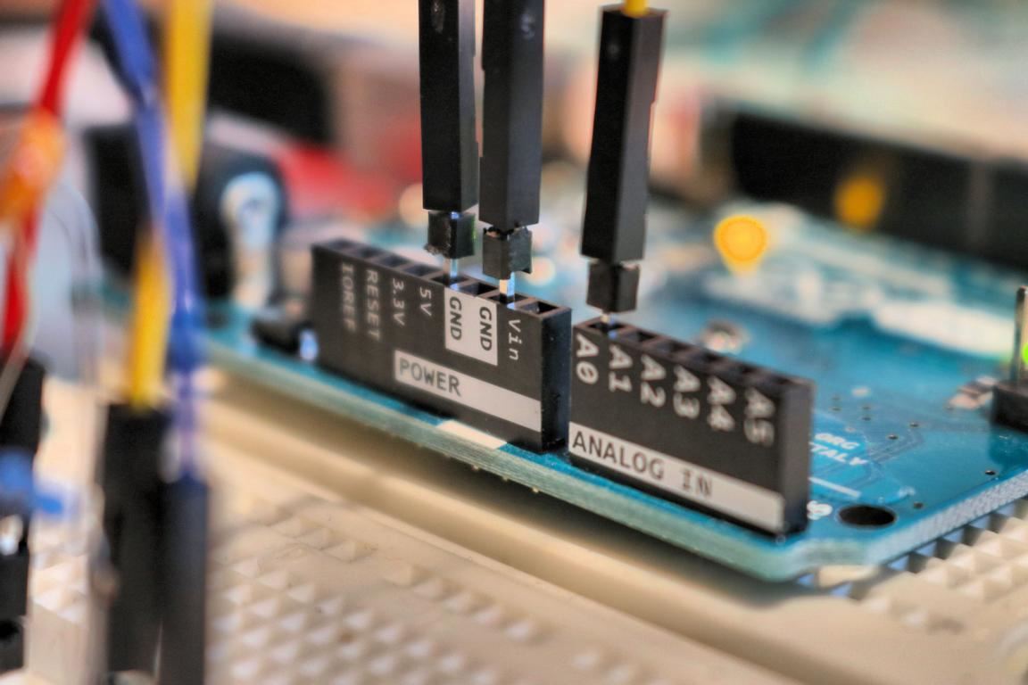 Der ständig sich ändernde Widerstand des LDR entspricht einem analogen Signal, das in dieser Schaltung über die grüne Signalleitung dem Arduino zugeführt wird. Hier ist wichtig, dass die Signalleitung an einem Pin angeschlossen wird, der analoge Spannungen verarbeiten kann. Beim Arduino sind diese mit ›Analog in‹ gekennzeichnet.