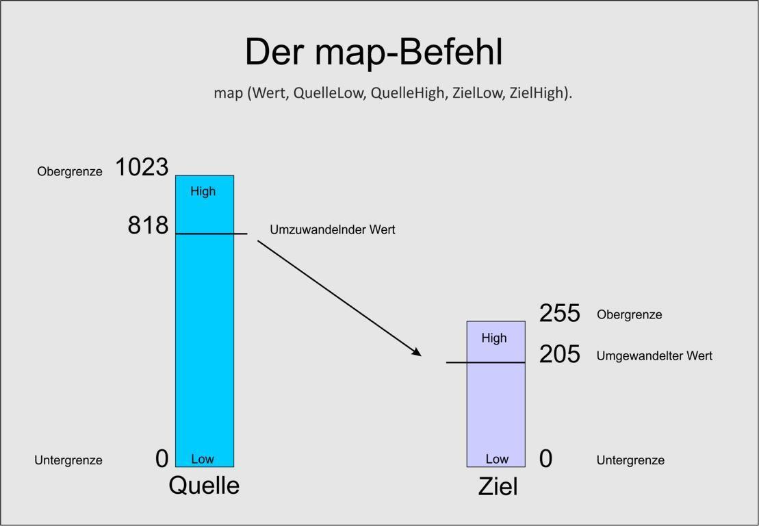 Dieser Befehl ist nach folgendem Schema aufgebaut: map (Wert, fromLow, fromHigh, toLow, toHigh). Er wandelt einen Wert, der sich zwischen zwei Werten eines Quellbereichs befindet, in eine Zahl um, die sich aus dem gleichen Verhältnis eines Zielbereichs ergibt.