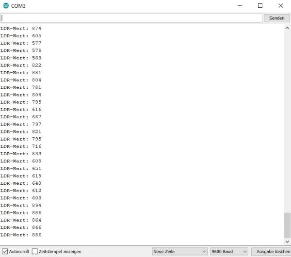 Die Ausgabe der LDR-Werte erfolgt über den sogenannten Monitor, der über Werkzeuge/Serieller Monitor aktiviert werden kann.