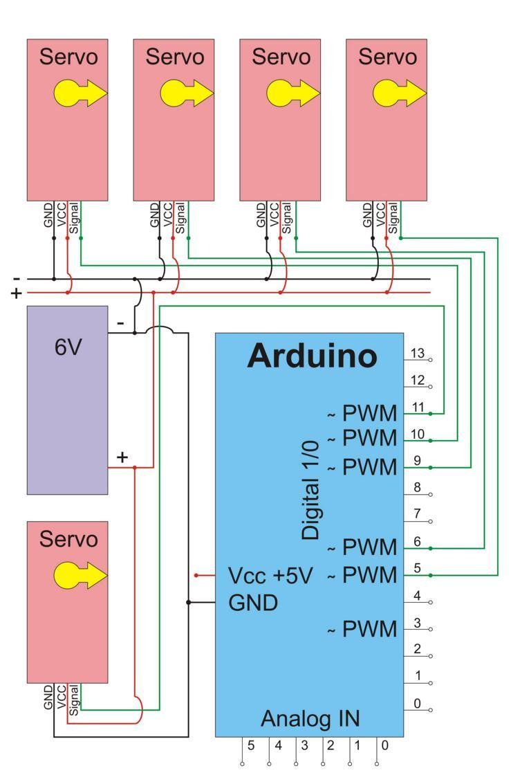 Zudem ist zu beachten, dass größerer Servos, wie bereits erwähnt, unbedingt mit einer externen Stromversorgung zu betreiben sind, da der Arduino durch deren hohen Strombedarf beschädigt werden kann.