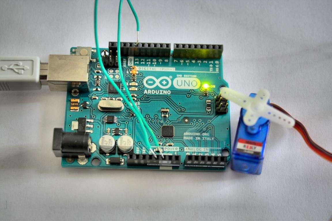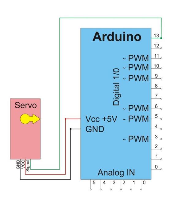 Wichtig ist, dass die Steuerleitung des Servos in jedem Fall auf einen PWM-Pin geführt wird. Dazu eignen sich beispielsweise die Pins 9, 10 und 11.