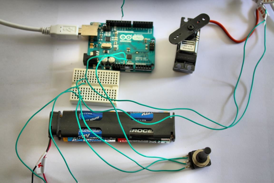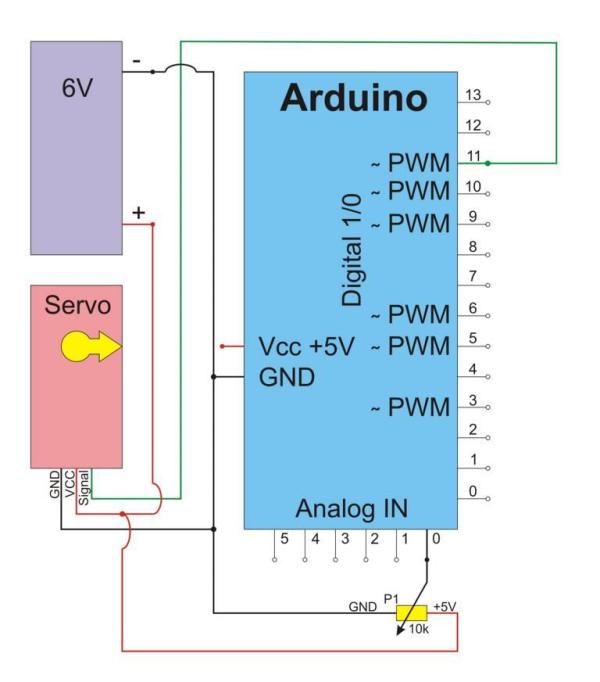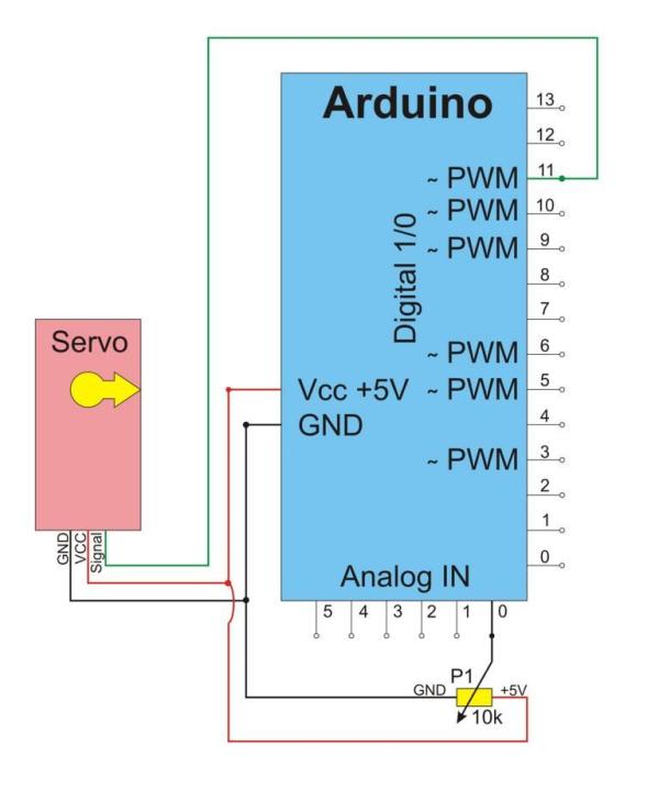 Während die Ansteuerung eines Servos per Zeitsignal ideal für Automatisierungszwecke ist, eignet sich die Ansteuerung über ein Potentiometer besonders gut für die manuelle Positionierung eines Servos.