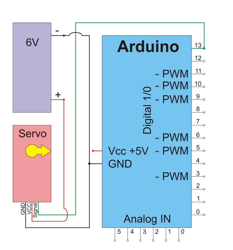 Die nötige Verschaltung des Servos muss wie im nebenstehenden Bild gezeigt vorgenommen werden.