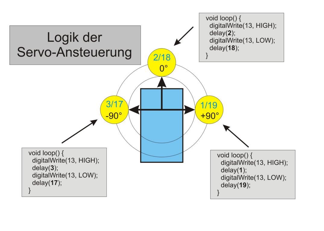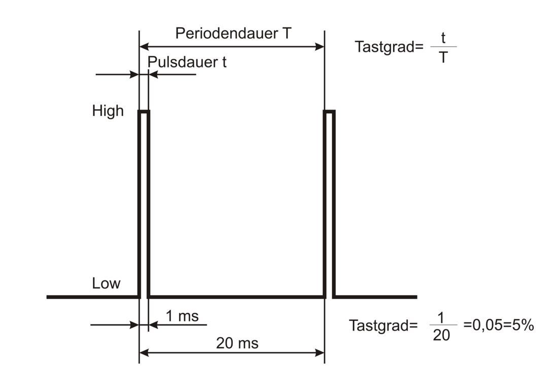 Servomotoren arbeiten mit der Pulsweitenmodulation (PWM). Dabei hat der High-Pegel eine Pulsbreite zwischen 0 und 2 Millisekunden, während der Low-Pegel den Rest bis zu einem Gesamtwert von 20 Millisekunden ausmacht. Ist der Low-Pegel beispielsweise 1 Millisekunde aktiv, so muss der Low-Pegel exakt 19 Sekunden Low sein, damit sich eine Gesamtdauer von 20 Millisekunden ergibt.