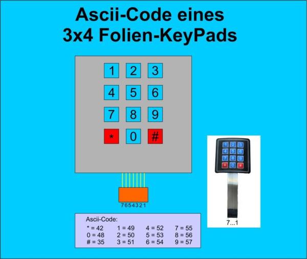 Nebenstehendes Bild listet den Ascii-Code für die Tasten des Keypads auf.
