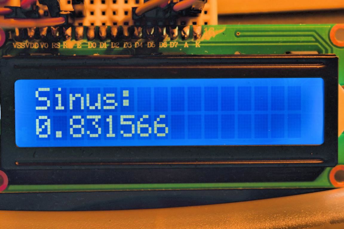 Anschließend ist der Sinus mit der Formel ›ergebnis =sin(zahl);‹ ermittelbar. Das Ergebnis präsentiert sich an der LCD-Anzeige wie folgt: