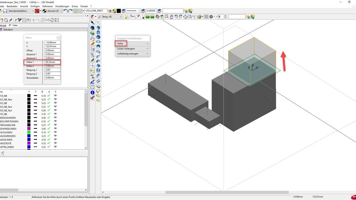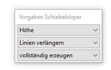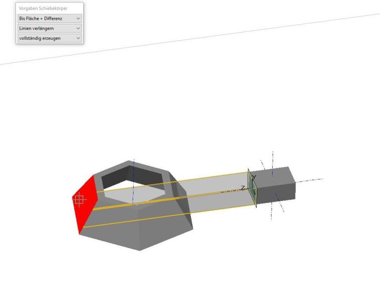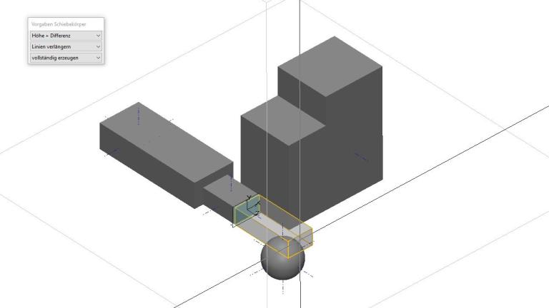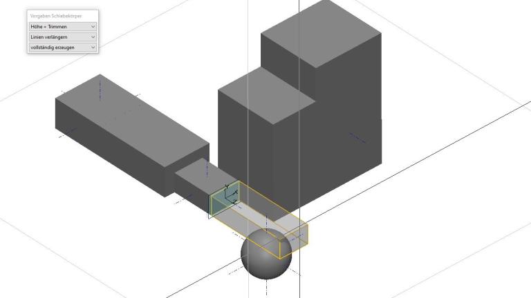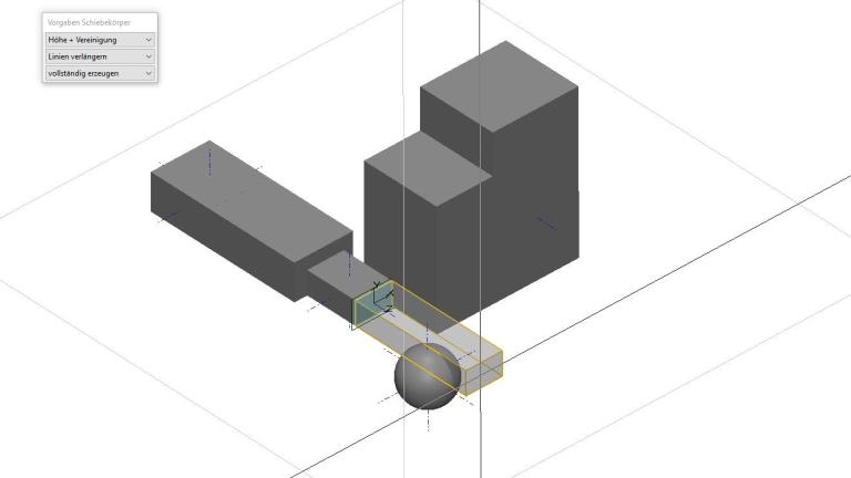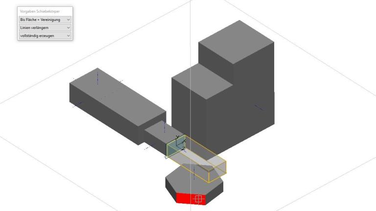In der Grundeinstellung beziehungsweise beim Start von BeckerCAD 3D Pro ist die Schiebekörperfunktion mit den Vorgaben „Höhe“, „Linien verlängern“ und „vollständig erzeugen“ aktiv.