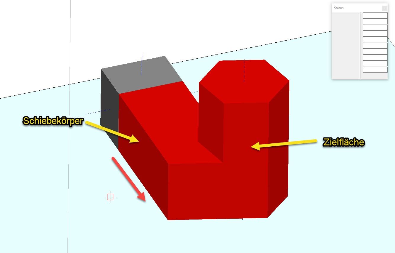 Diese interessante Funktion erzielt überraschende Resultate: Anstatt eine feste Länge (z. B. 50 mm) für die Extrusion einzugeben, wird der Schiebekörper so weit „geschoben“, bis er auf die ausgewählte Zielfläche trifft. Der Körper passt sich automatisch der Form der Zielfläche an. Wenn die Fläche gewölbt oder schräg ist, wird das Ende des Schiebekörpers exakt auf diese Kontur zugeschnitten.