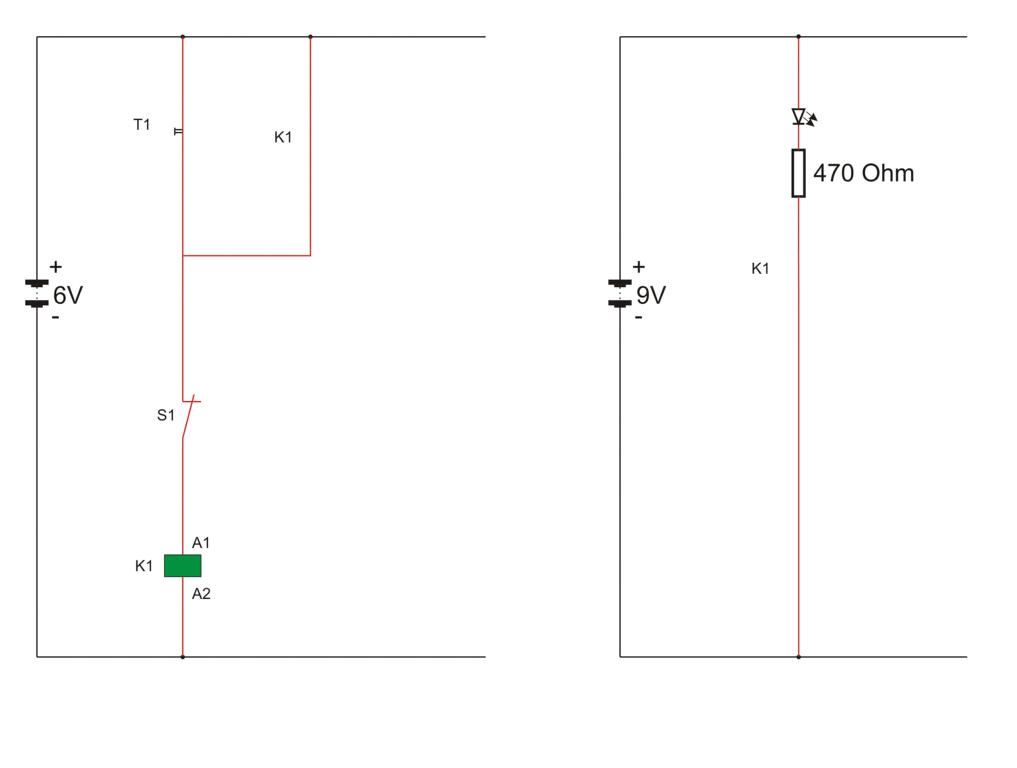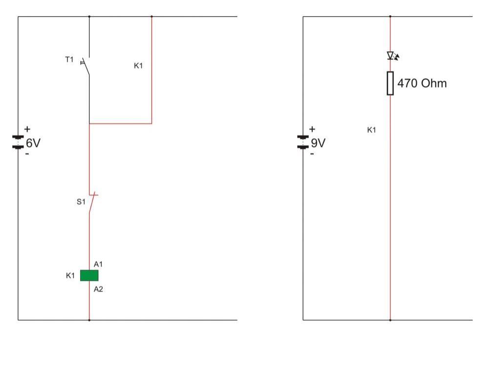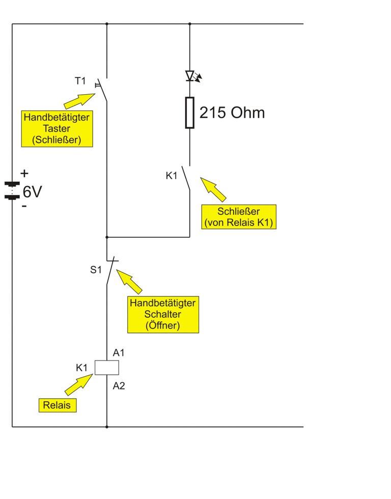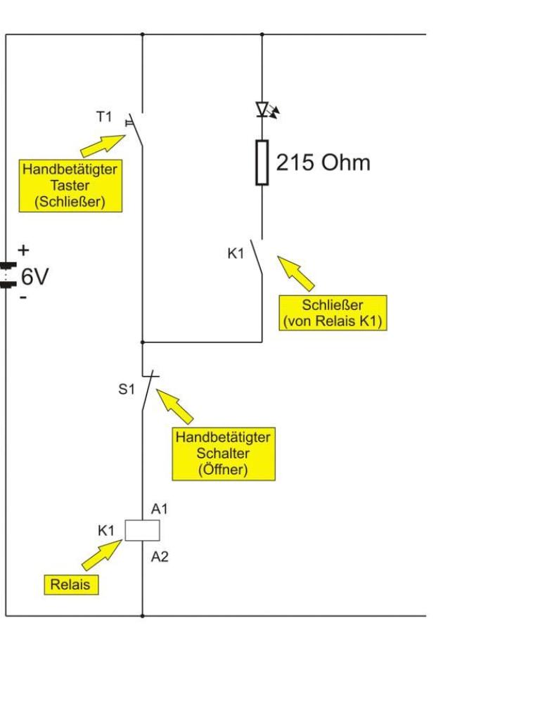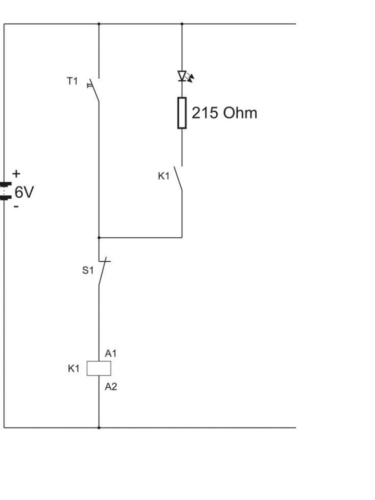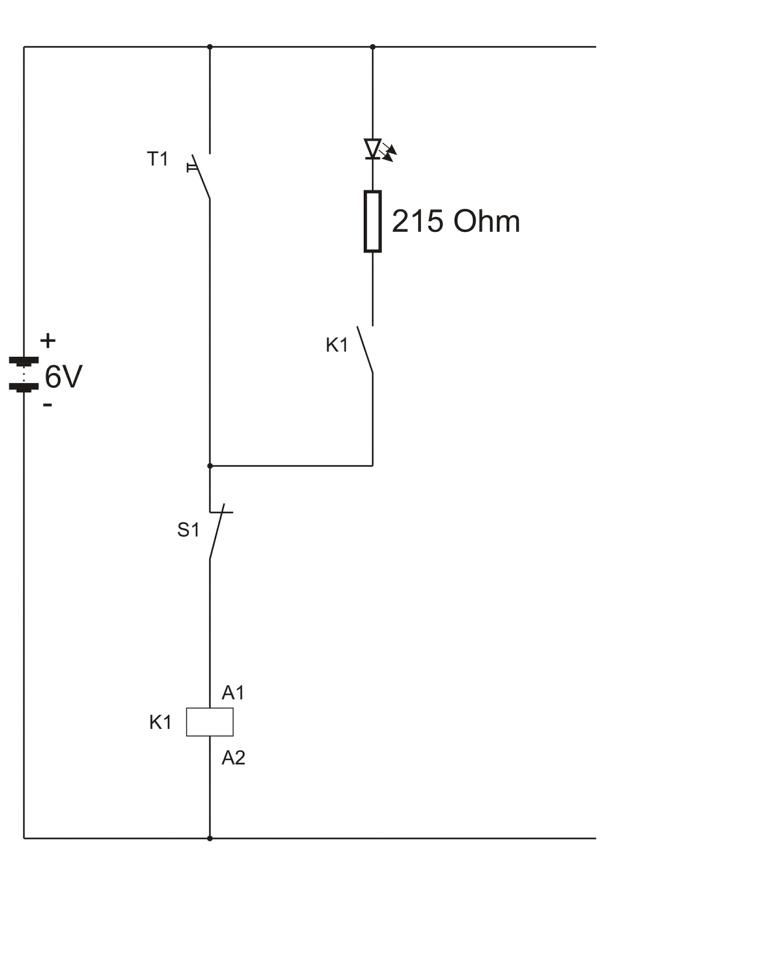 Zur Überprüfung dieser Aussage ist es zweckmäßig, eine reale Schaltung auf- und eine LED in die Schaltung einzubauen. Diese LED wird auch dann noch leuchten, wenn der Taster T1 nicht mehr betätigt wird.